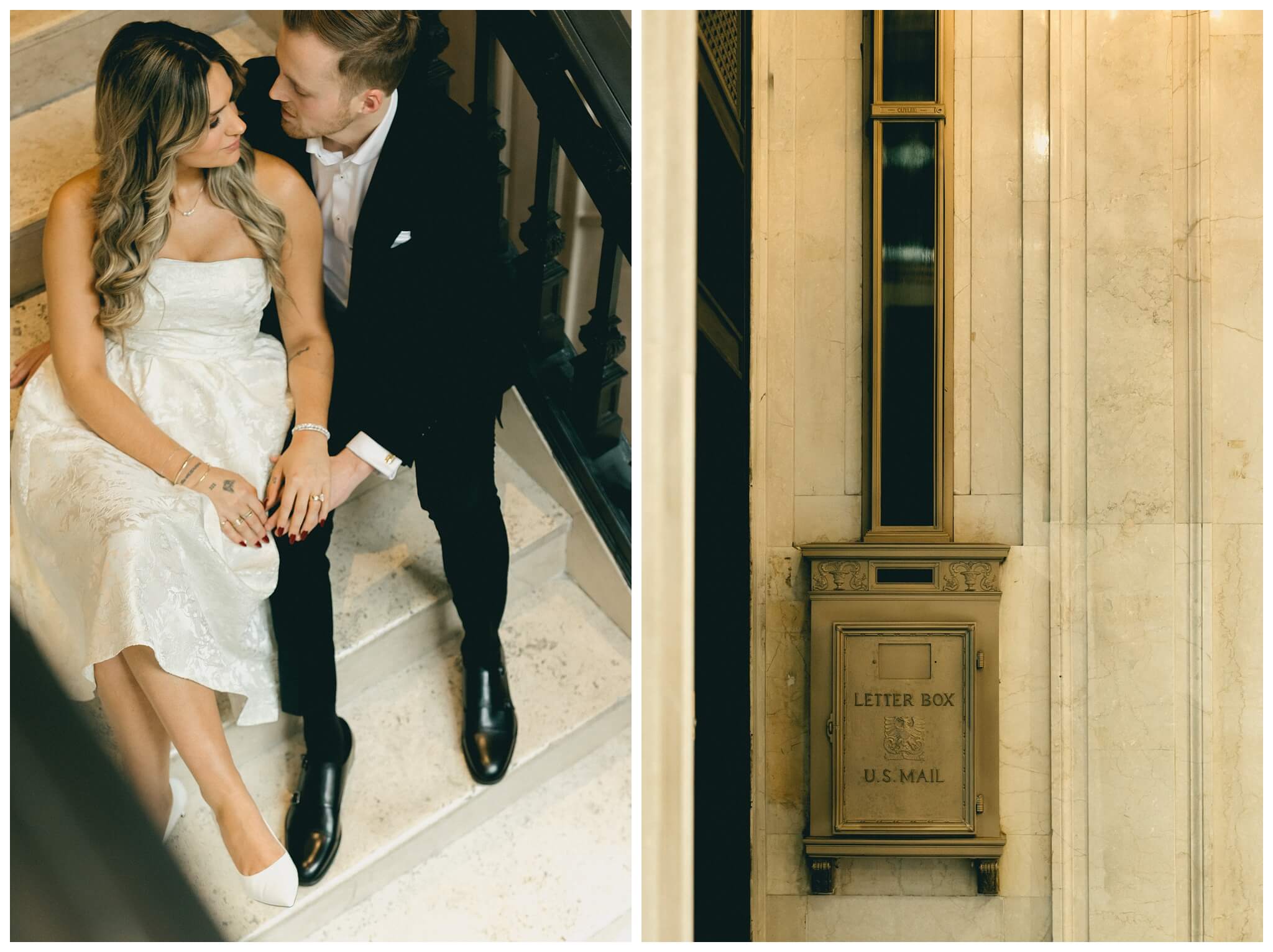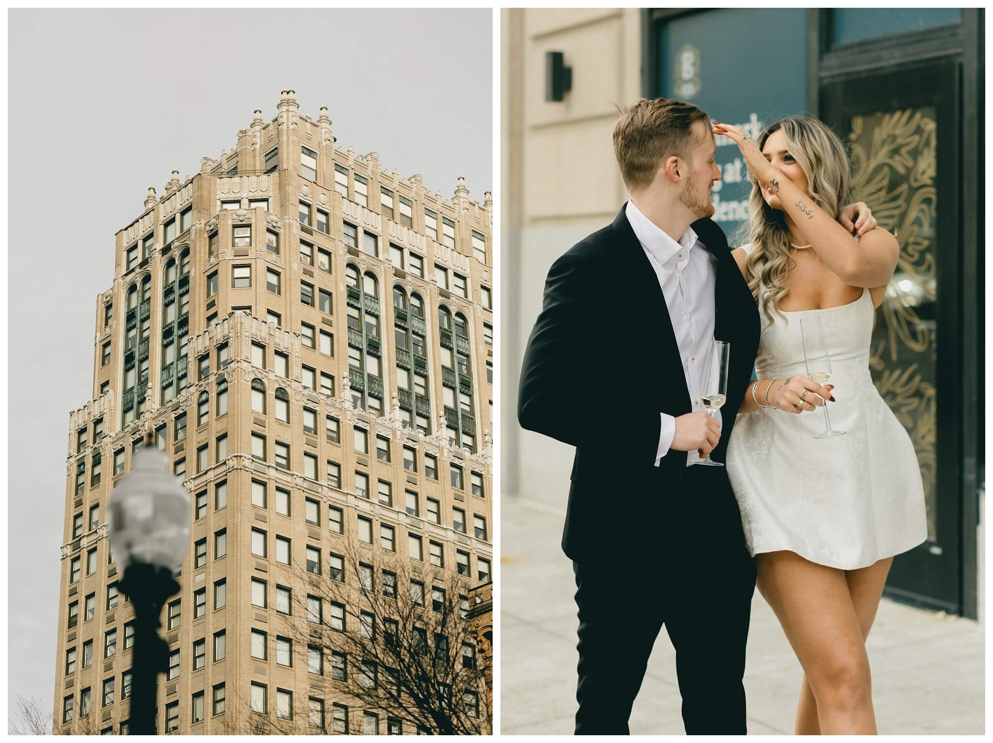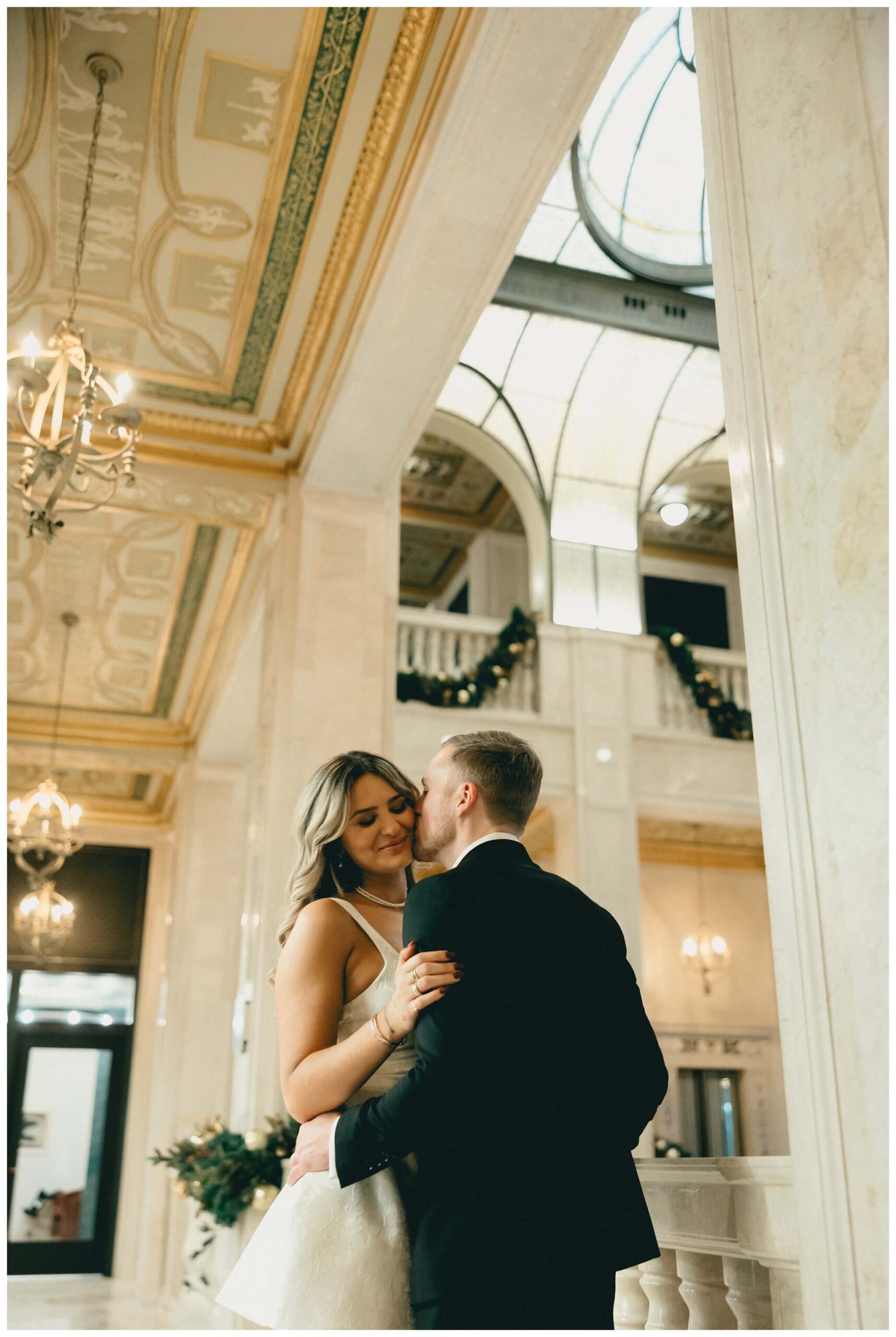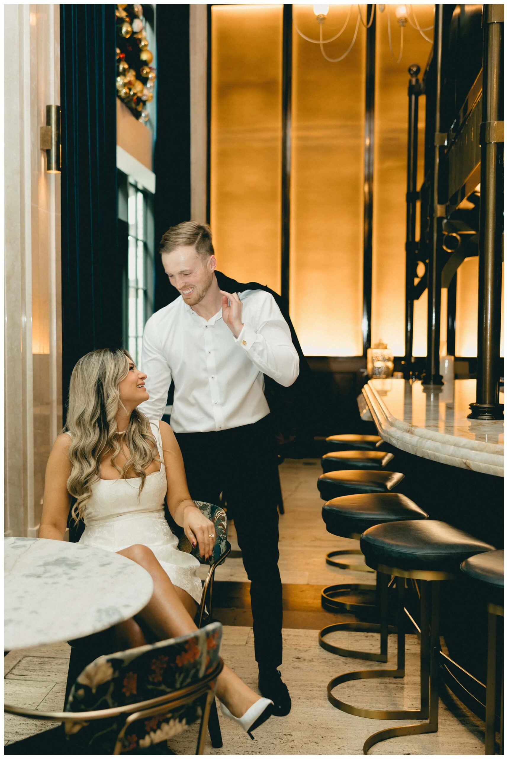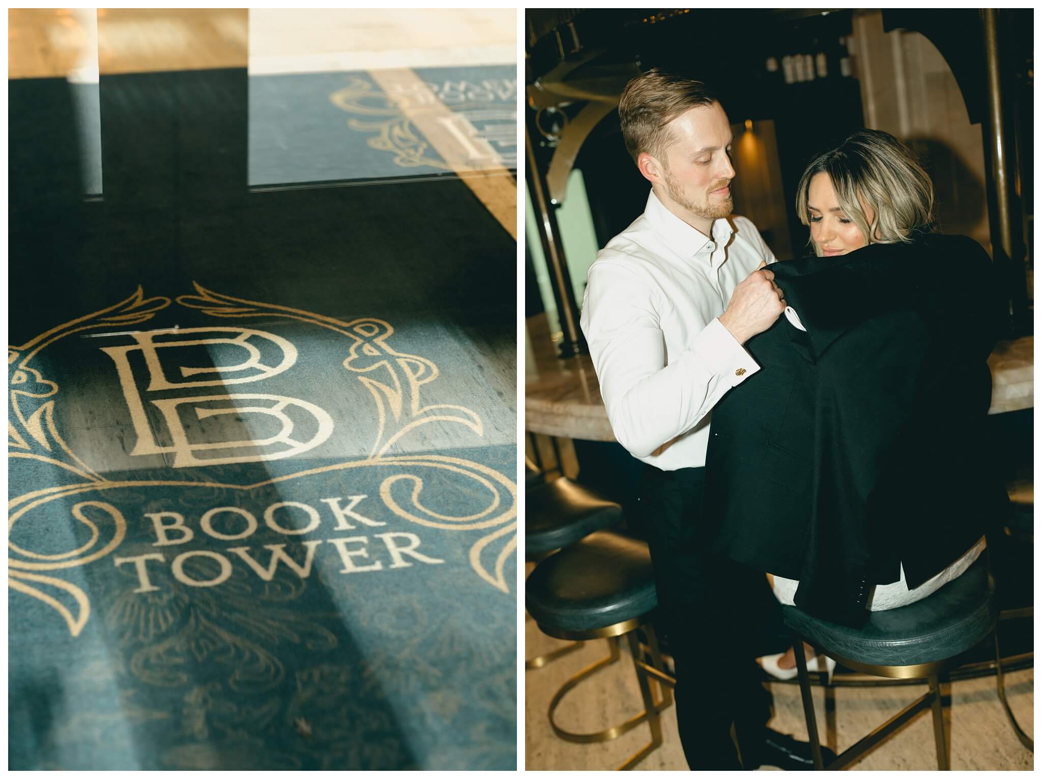 Winds whipped through the city with a frosty chill. Long past were the days of warm sunshine and here to stay were longer nights and snowy encounters. But in the heart of the Book Tower, the cold and dreariness of the season were a distant memory for Alyssa and Braeden. Already decorated for Christmas, the Book Tower became its own unique character in the story of their engagement shoot as the warm lights cast a soft glow across the staircase. As he took her hand in his, Alyssa felt a sudden rush of emotion. Even though his hand was so familiar, this moment felt special. They were finally getting to celebrate their engagement, and soon, the celebration would become even more real as they became husband and wife.