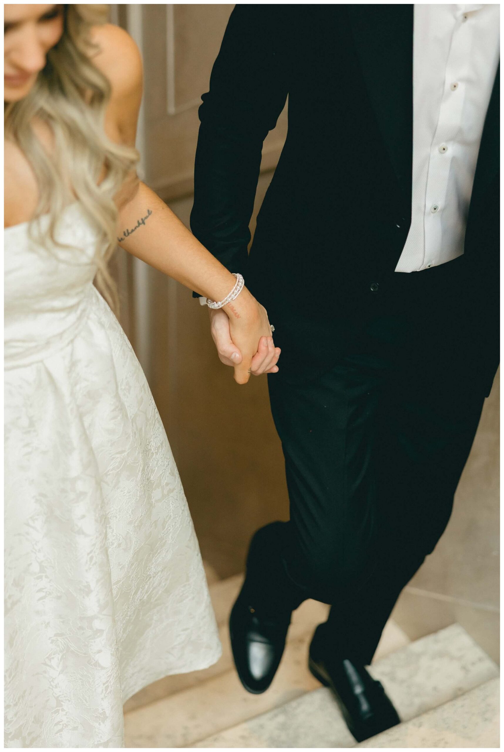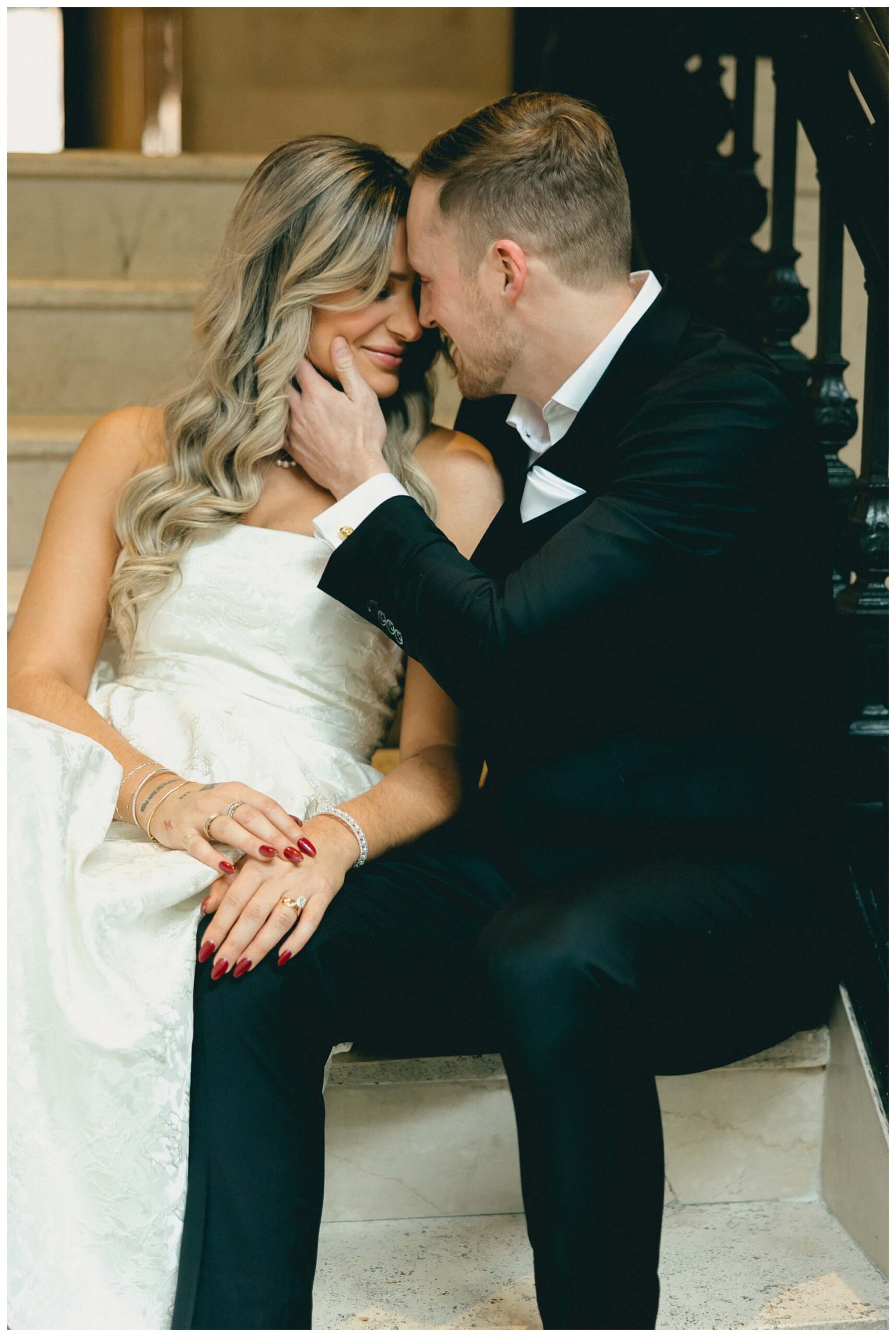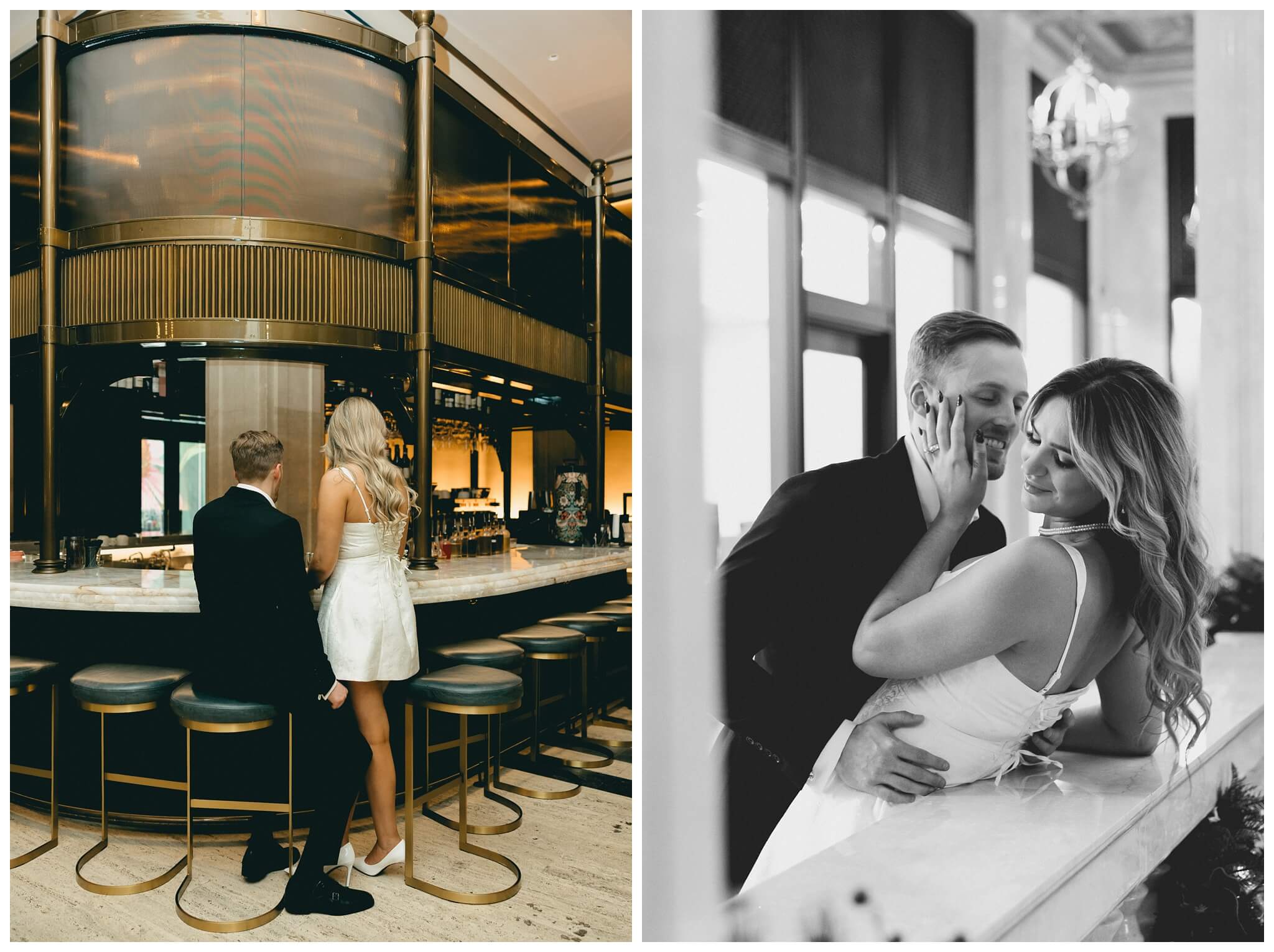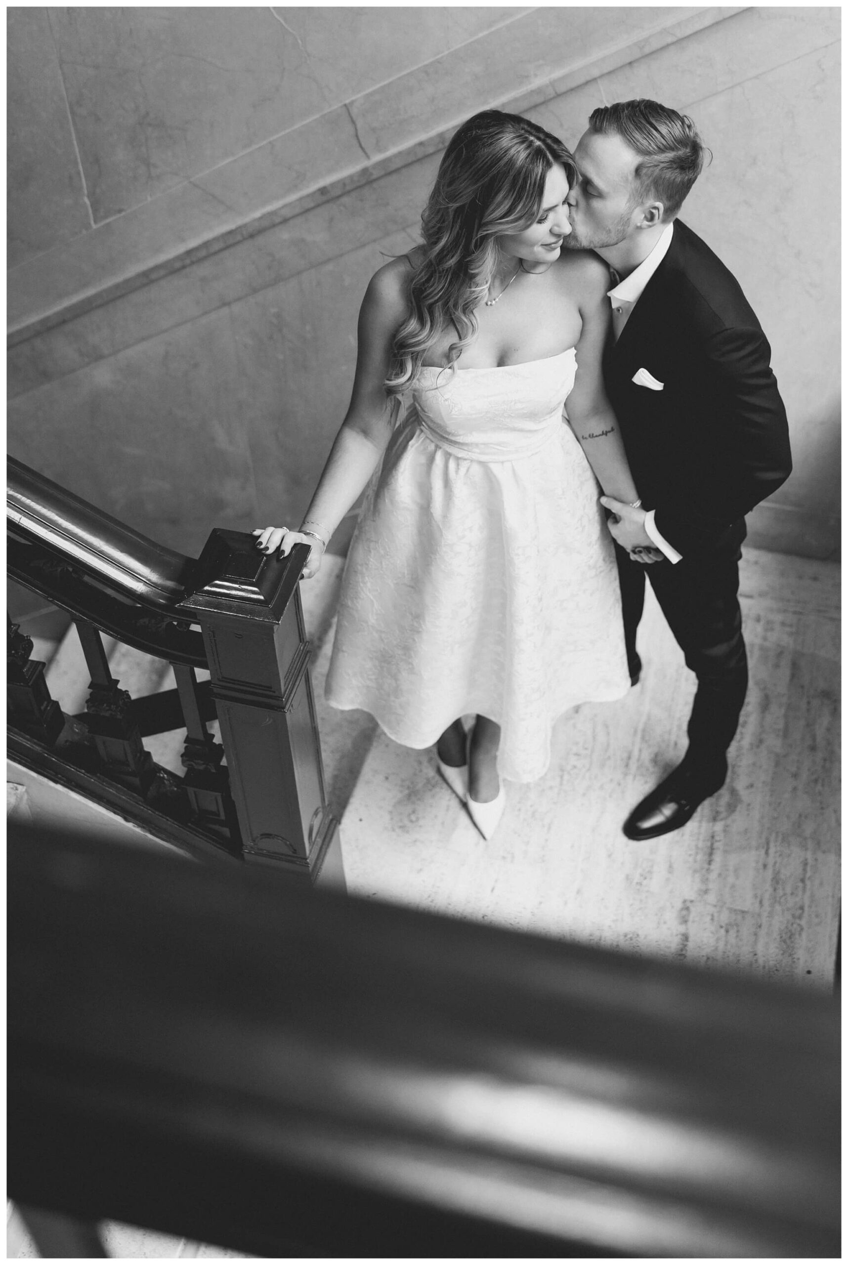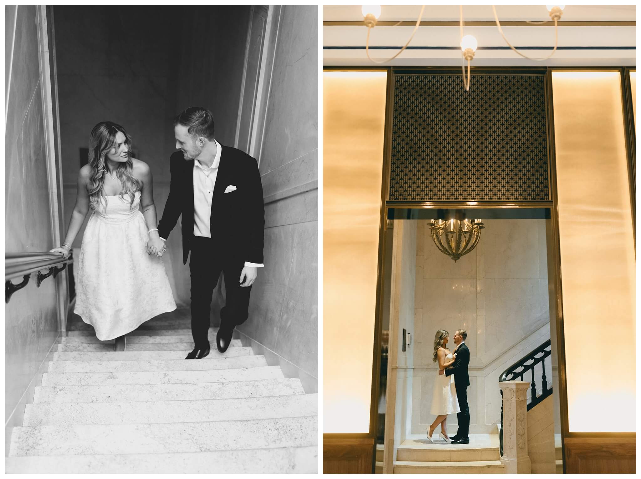 Winds whipped through the city with a frosty chill. Long past were the days of warm sunshine and here to stay were longer nights and snowy encounters. But in the heart of the Book Tower, the cold and dreariness of the season were a distant memory for Alyssa and Braeden. Already decorated for Christmas, the Book Tower became its own unique character in the story of their engagement shoot as the warm lights cast a soft glow across the staircase. As he took her hand in his, Alyssa felt a sudden rush of emotion. Even though his hand was so familiar, this moment felt special. They were finally getting to celebrate their engagement, and soon, the celebration would become even more real as they became husband and wife.