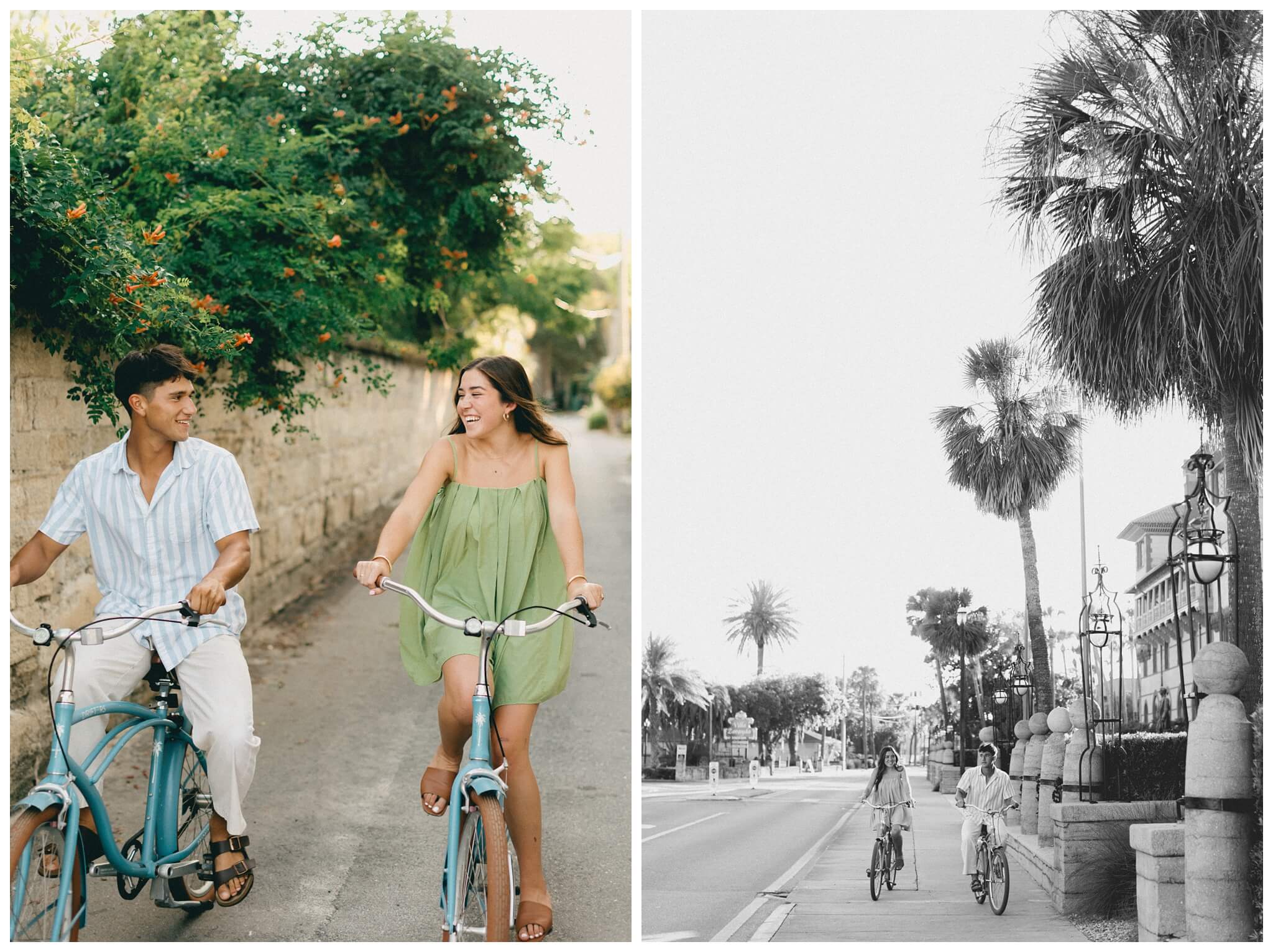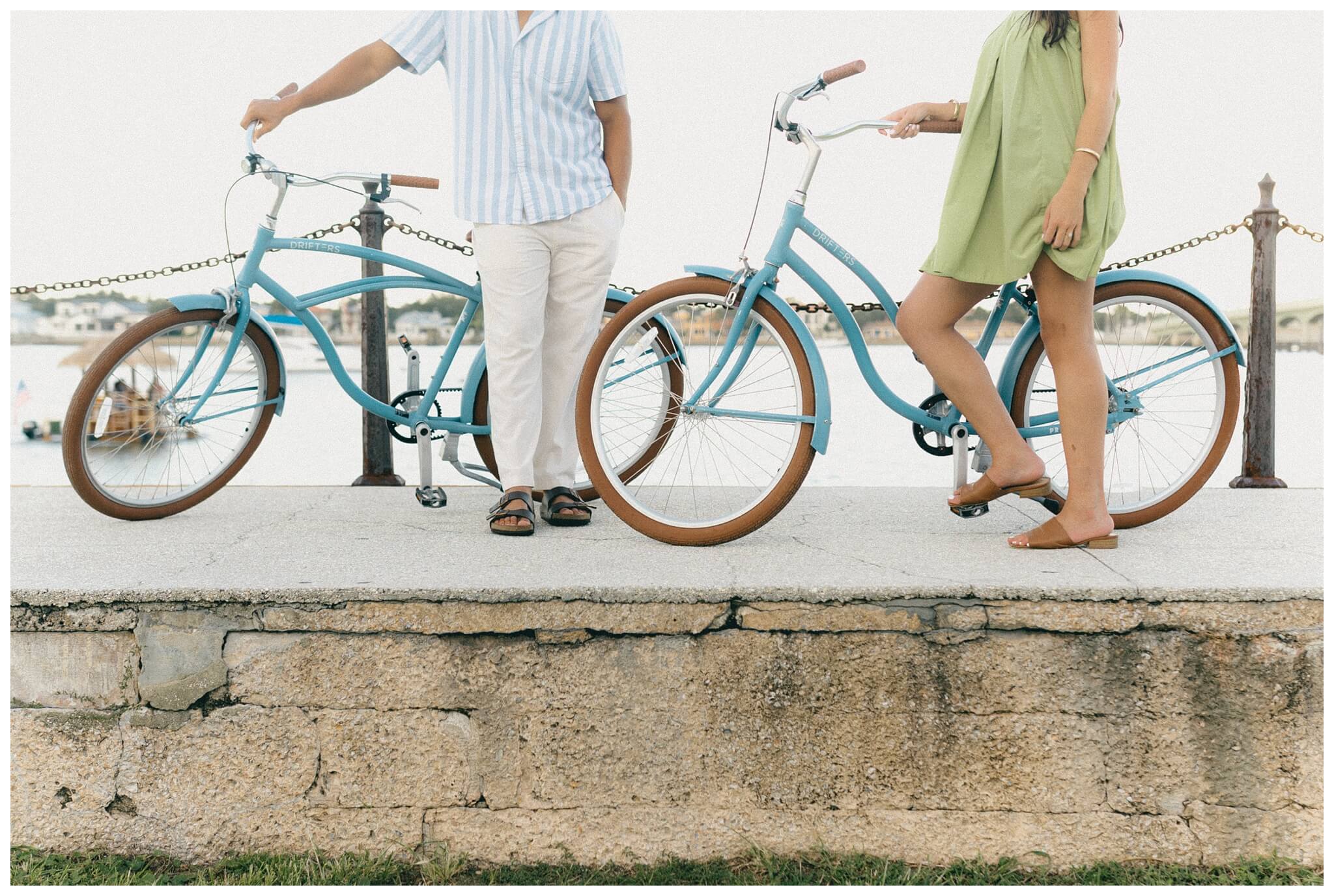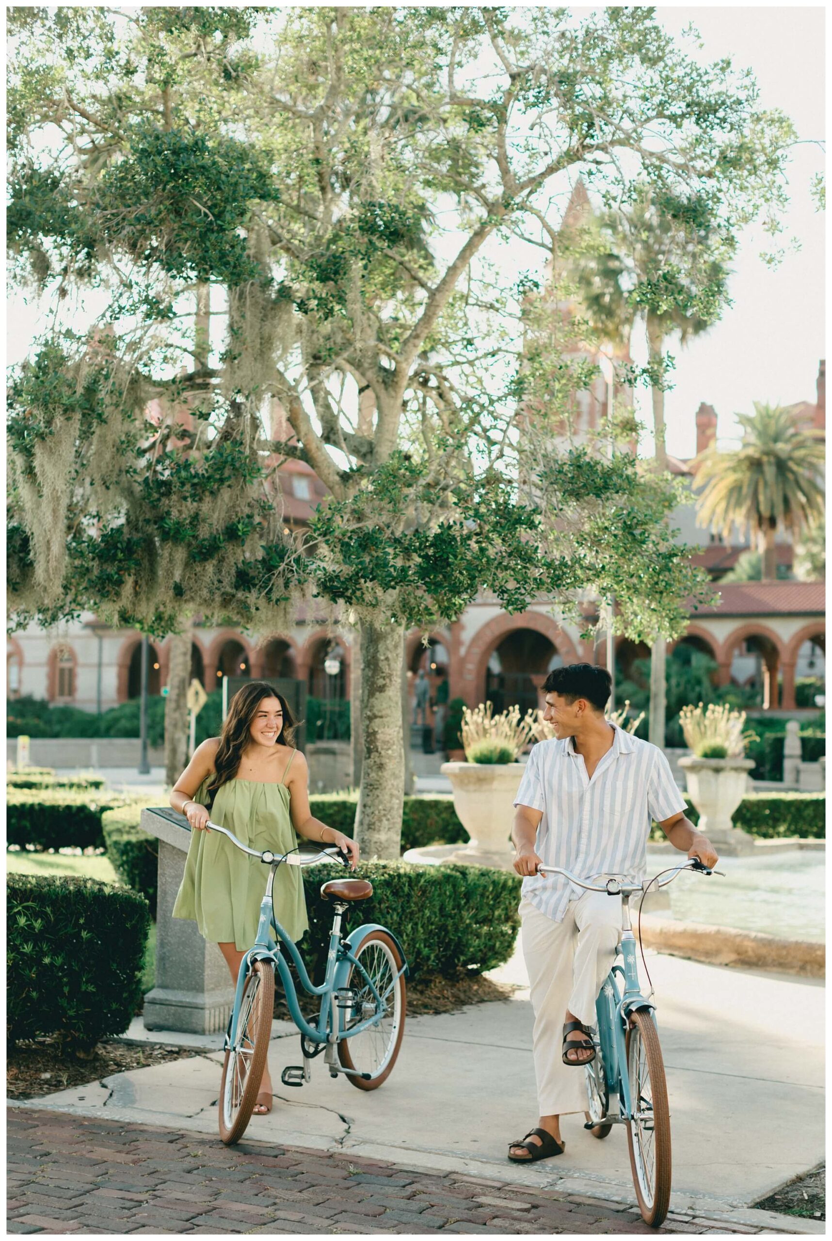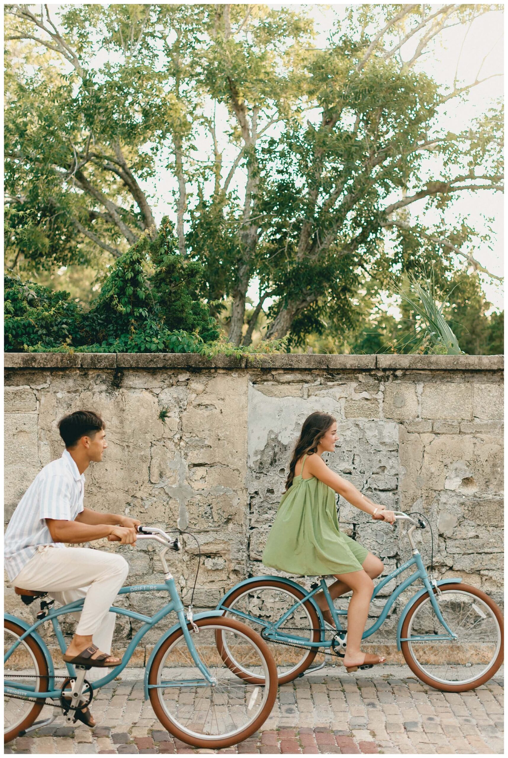 The sounds of the street slowly faded into the background as the baby-blue bicycles cruised off down the historic alleys of St Augustine. Catalina, leading the way, turned to laugh back at Noah and beckon him to join her. He was completely blown away by the perfection of the moment; the sunlight perfectly catching her hair as the wind blew though creating a halo of light around her. He quickly caught up to her, and as they continued their tour of the town, they both found themselves thinking of the not too distant future when they would be able to go on bike rides like this every day as husband and wife.