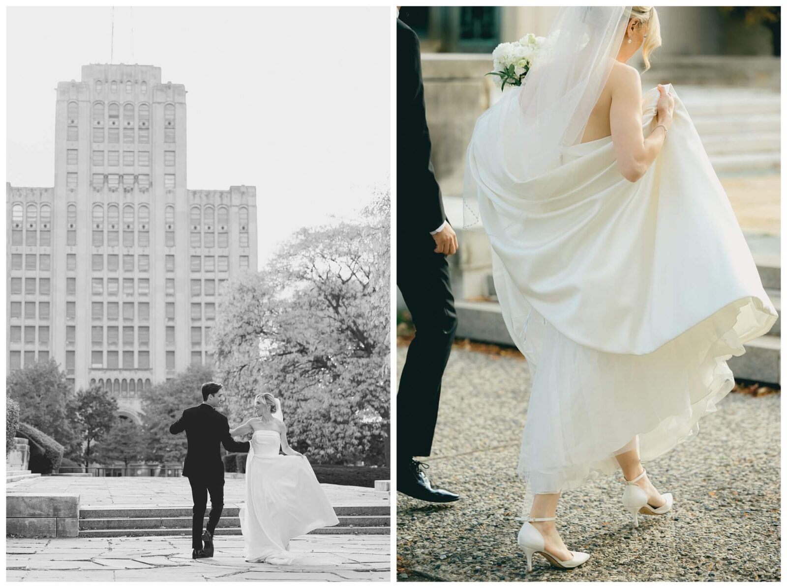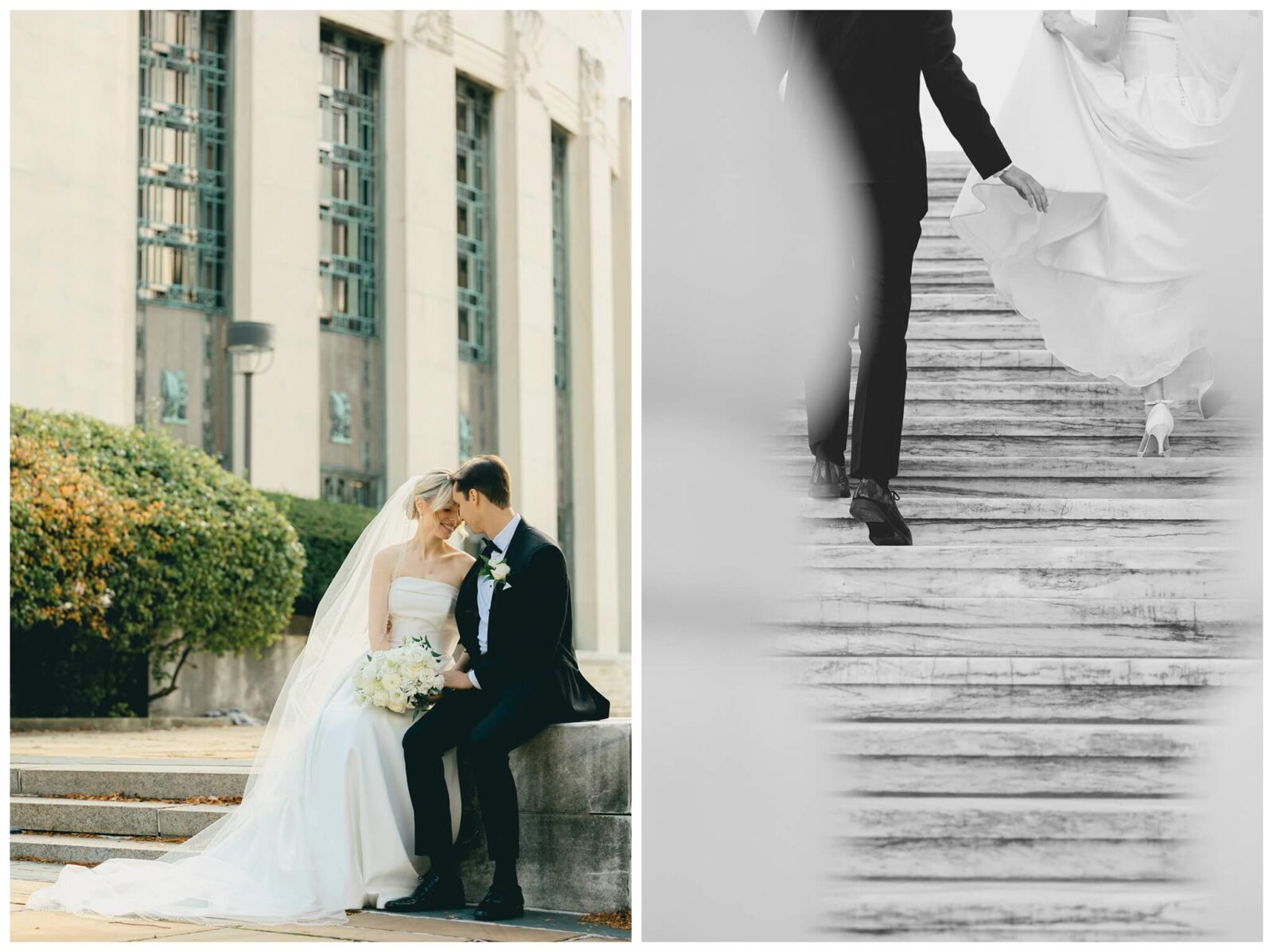 Following the ceremony, Kathryn and Ryan made their way through downtown Detroit for portraits. With architecture that blends historic beauty and modern energy, the city offered the perfect backdrop for capturing this next chapter of their story. From iconic landmarks like the Detroit Institute of Arts to the quiet in-between moments, their portraits reflected the same effortless connection that carried them through the entire day. There was a sense of nostalgia woven into each stop, like a subtle nod to the classic romance that inspired them.