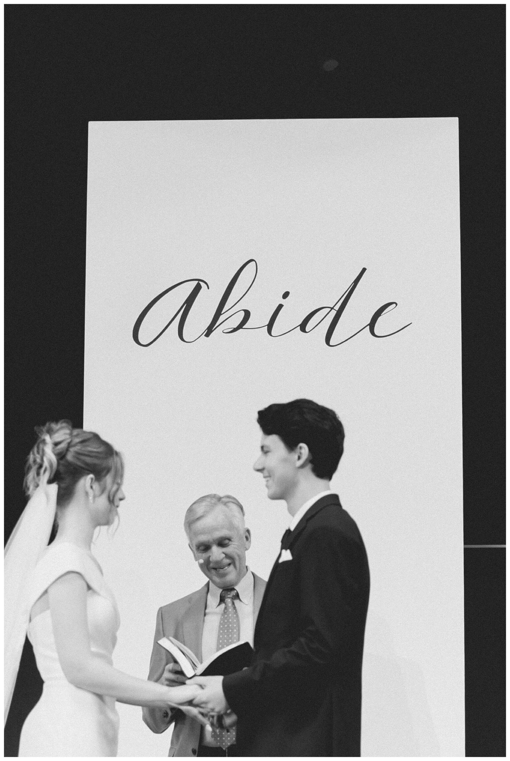 The word hung above them as all eyes were directed to the front of the chapel. “Abide.” It was a word that Eliza and Bradley had embraced early on as both the goal and focus of the entire day. Abide in the moments; to not rush through the day, but to sit and enjoy every second of their wedding day. Abide in each other; the person they had found who would, from now on, be “Home.”  But most important to Eliza and Bradley, Abide in the One who had given them every good gift in their life, including each other. As Eliza and Bradley leaned in for their first kiss as husband and wife, it seemed only fitting that this beautiful word floated above them, a symbol of the beautiful perspective and foundation their lives would now be built upon.
