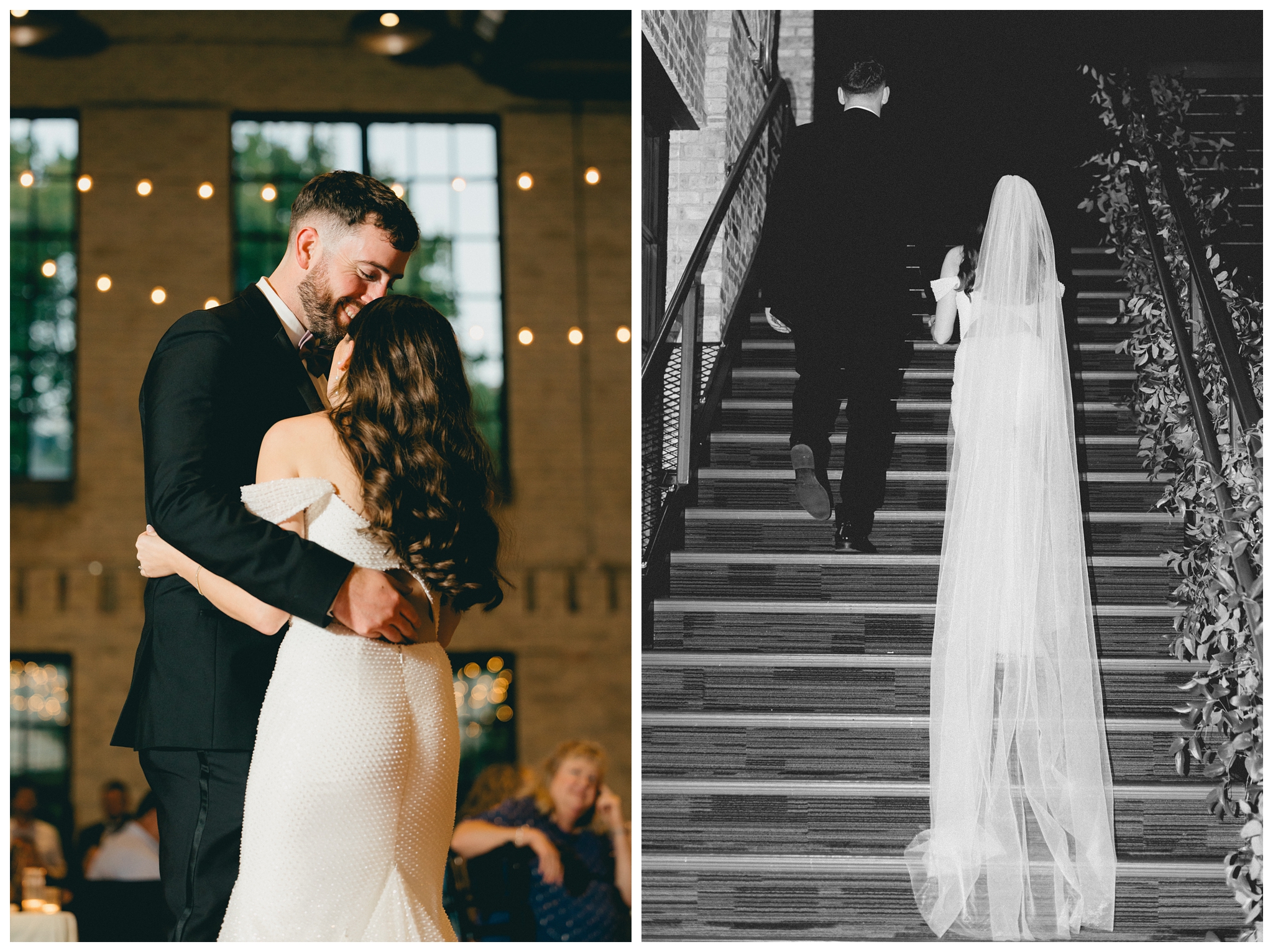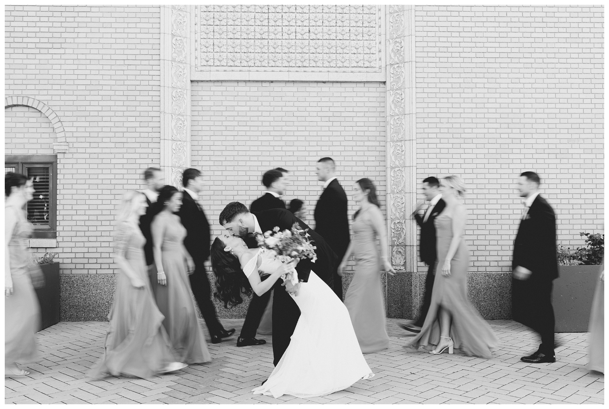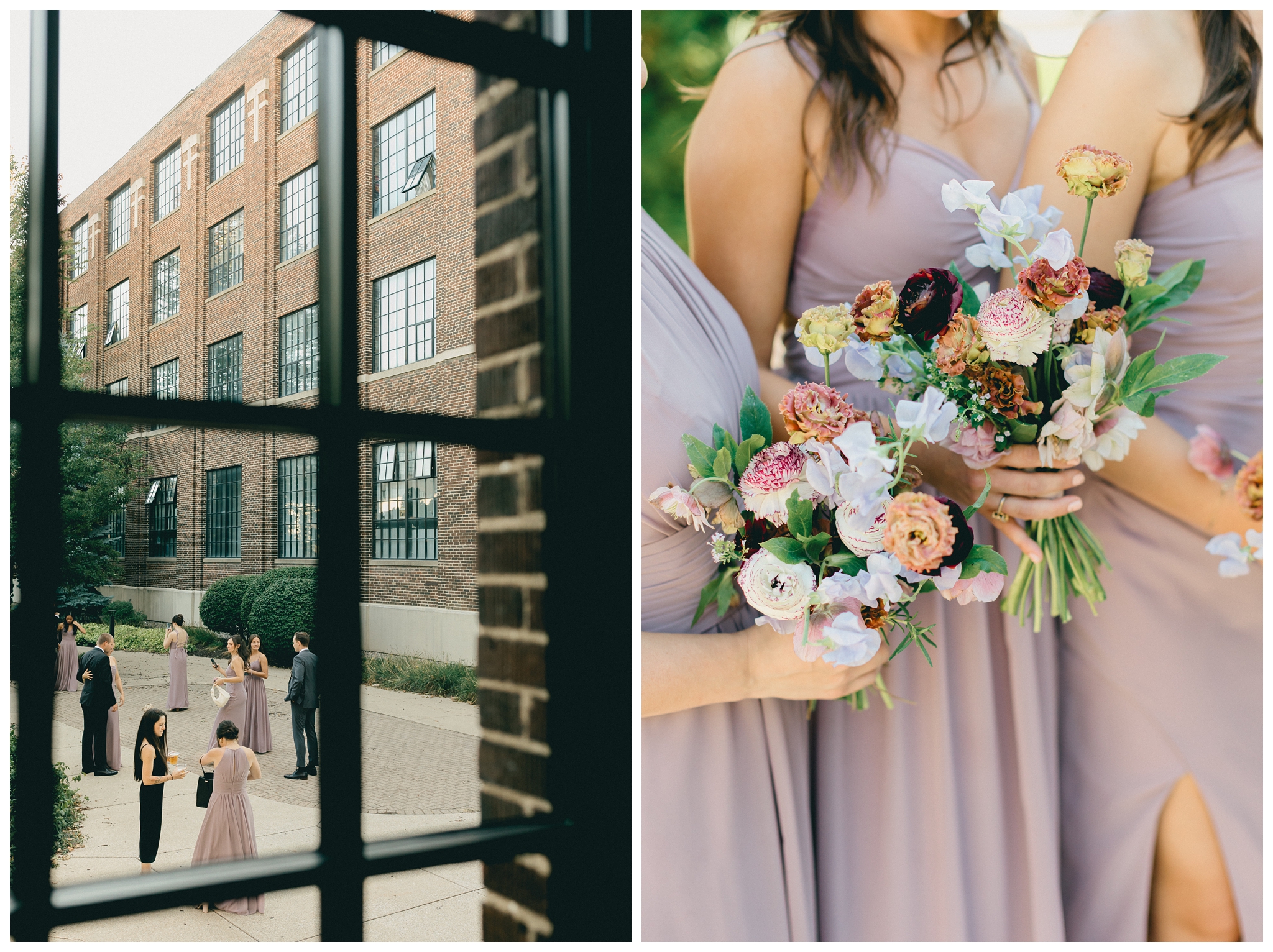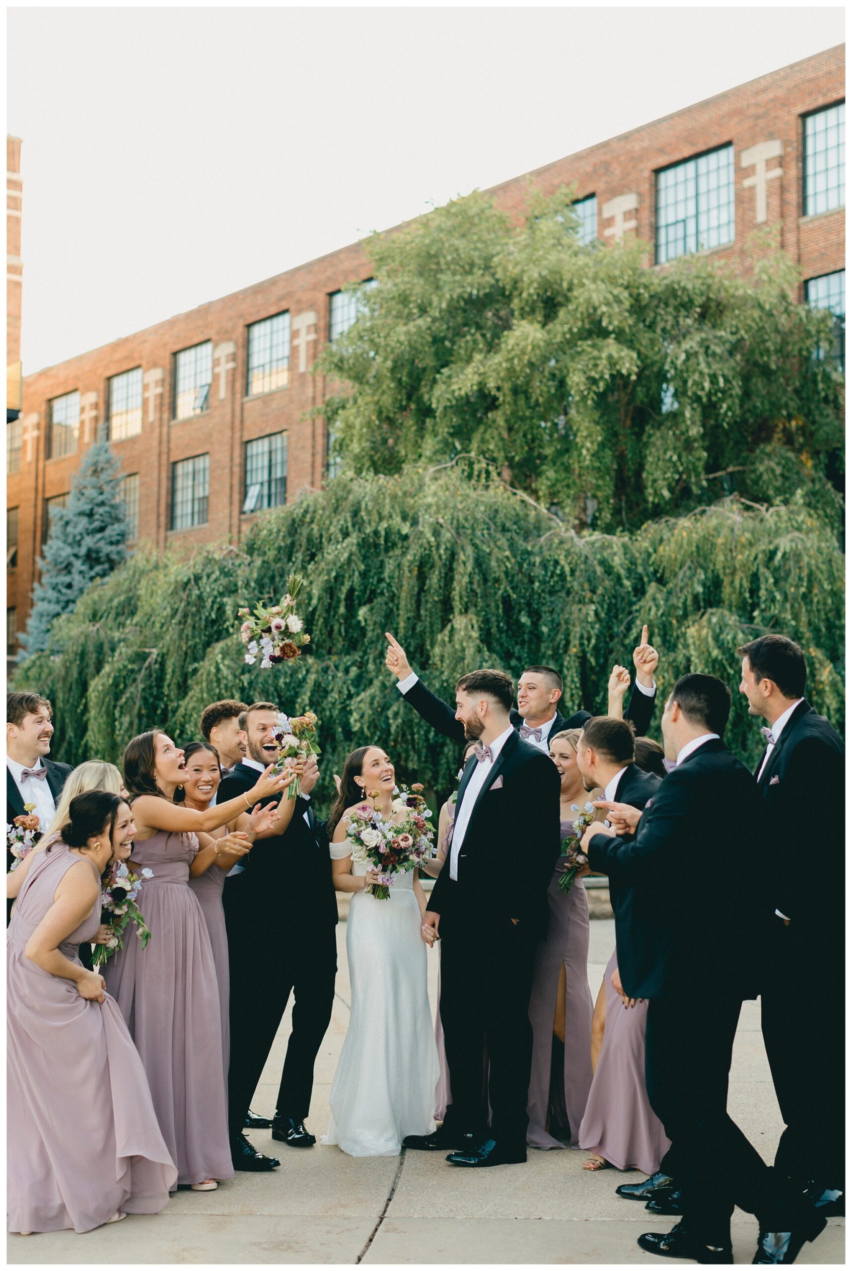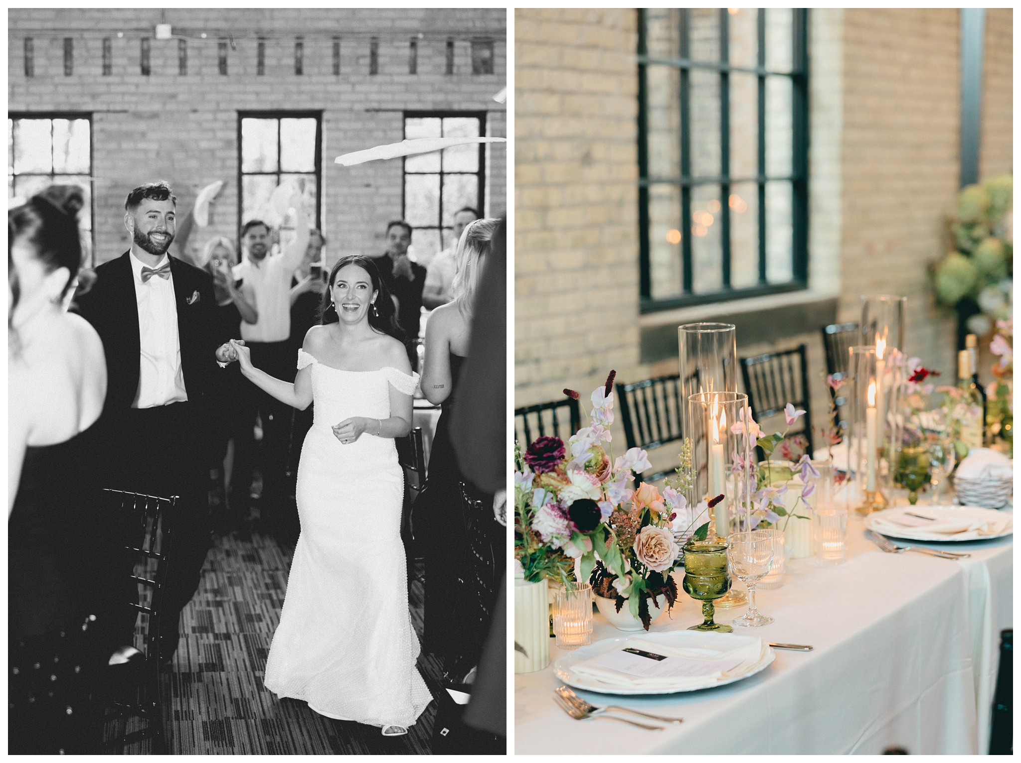 The sounds of the Art Prize Celebration floated up from the streets to the upper levels of the Grand Rapids skyline on the morning of Sarah and Jeff’s wedding. The Amway Grand Plaza, one of Grand Rapid’s finest hotels, provided exquisite rooms and elegant aesthetics for both Sarah and Jeff to prepare for the day, surrounded by those that they held dearest. Instead of waiting til later into the day, Sarah and Jeff had always wanted to get married as quickly into the day as possible, so after a quick ride over to New Vintage Place, the bridal party hid away as guests began to arrive for the ceremony. All eyes were on Sarah as her father escorted her down the aisle, right in the arms of the man who had kept mentioning her name all morning long in eager anticipation. Before they could even believe it, their friend and officiant Griffin was announcing them as Mr. and Mrs. Jeff Perry as they recessed down the aisle to the thunderous applause of the crowd. Sarah had always felt drawn to the dramatic ambiance of New Vintage Place, and a mini “studio session” in the middle of the wedding day provided some truly iconic portraits of both Sarah and her new husband. However, the architecture and charm of the city called to them as well, culminating with a second portrait session along the streets of Grand Rapids rounding out their time in front of the camera. Upon their return to NVP, Sarah and Jeff were greeted by their vision come to life in the reception space, all thanks to the vendor team led by In the Details Weddings. Warm purples mixed with dusty mauve in the florals, bringing a “soft autumn” aesthetic to the space before them. As dinner was served, both Sarah’s sister and Jeff’s best friend addressed the crowd, recounting tales and memories spent with Sarah and Jeff and reminding all in the room just how special the bride and groom were to everyone in attendance. As the music began and the dance floor started filling up, Sarah quietly slipped away, only to return in an iconic entrance with an outfit change that signaled to all that the party was just getting started.