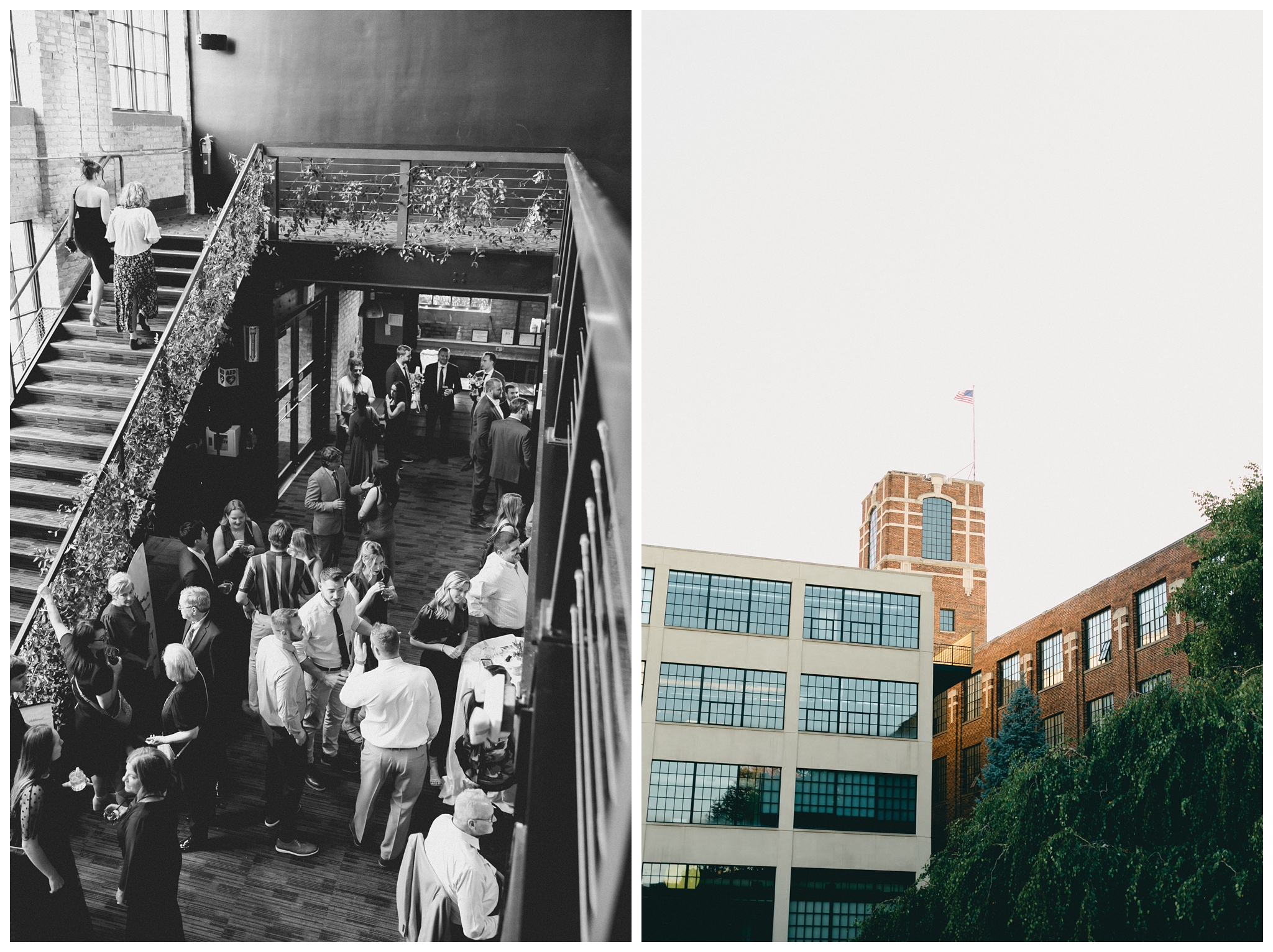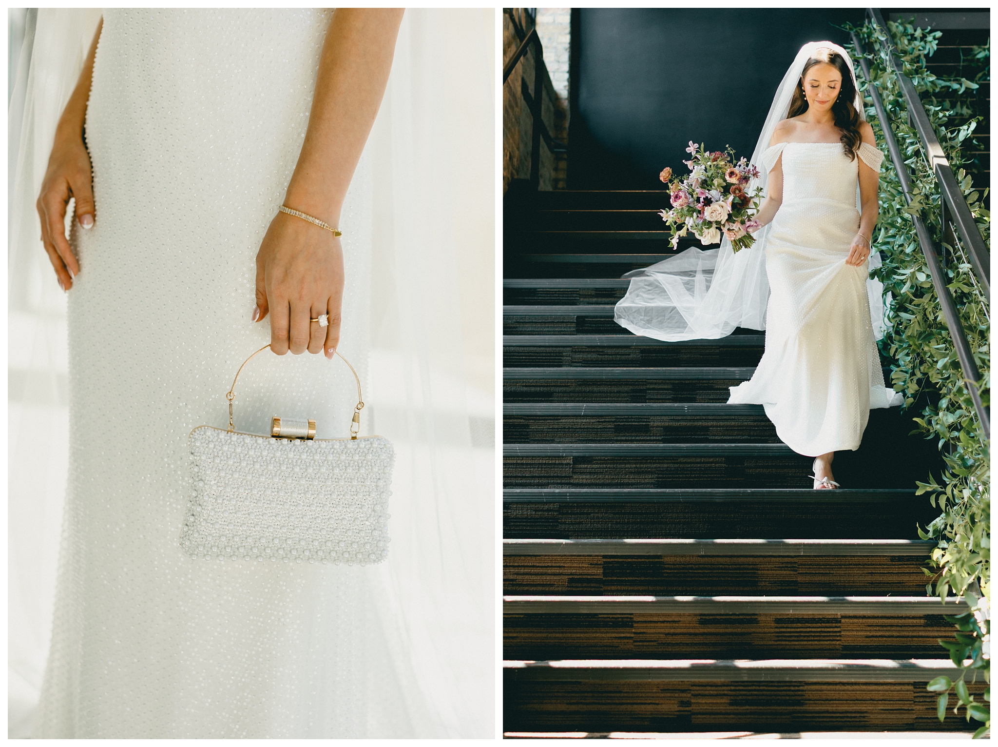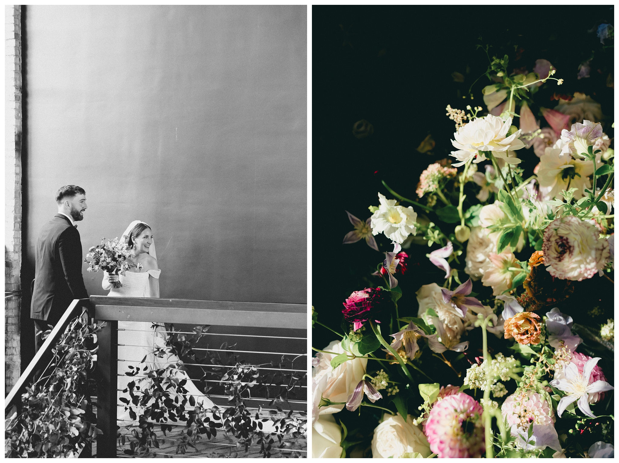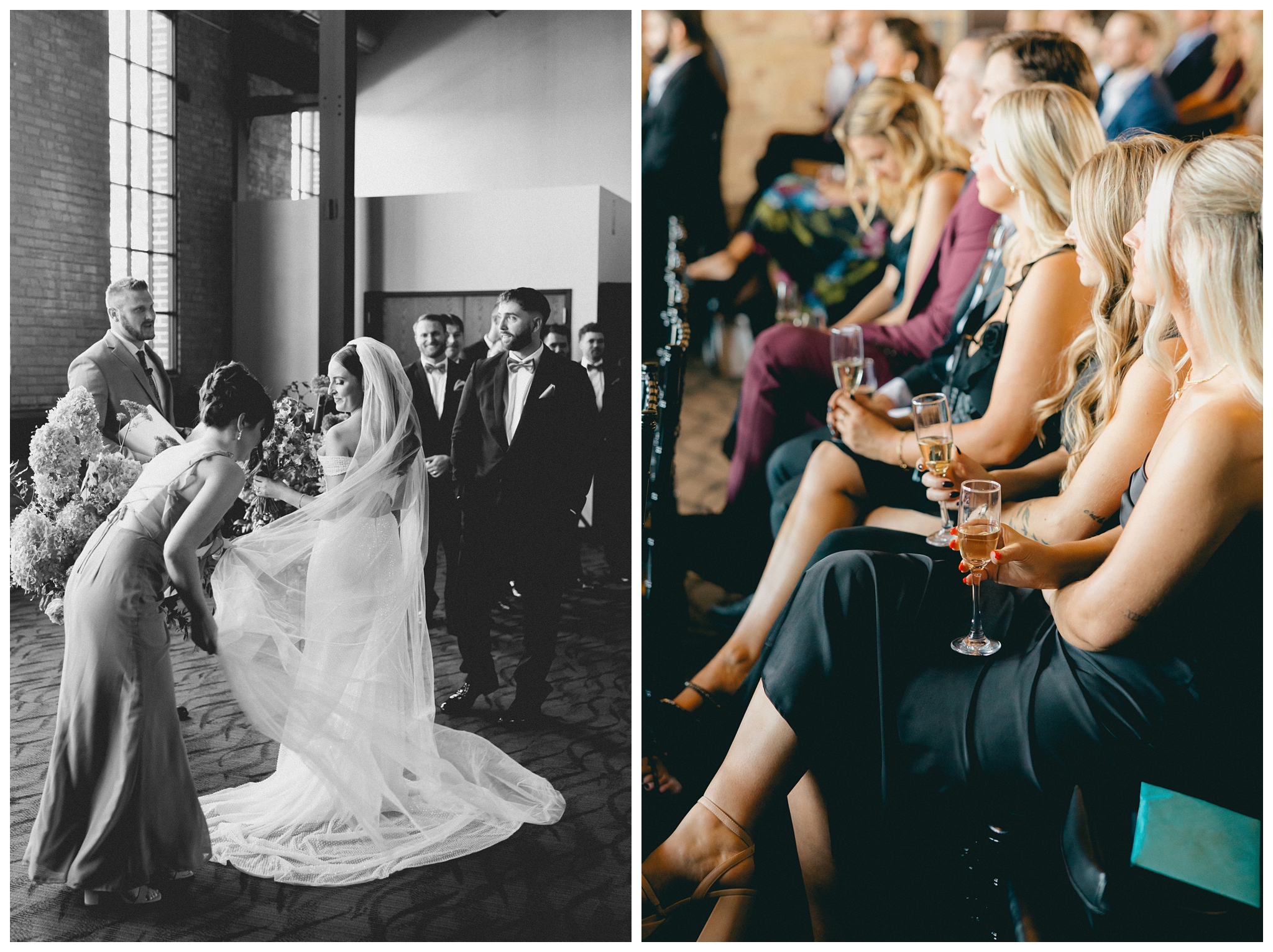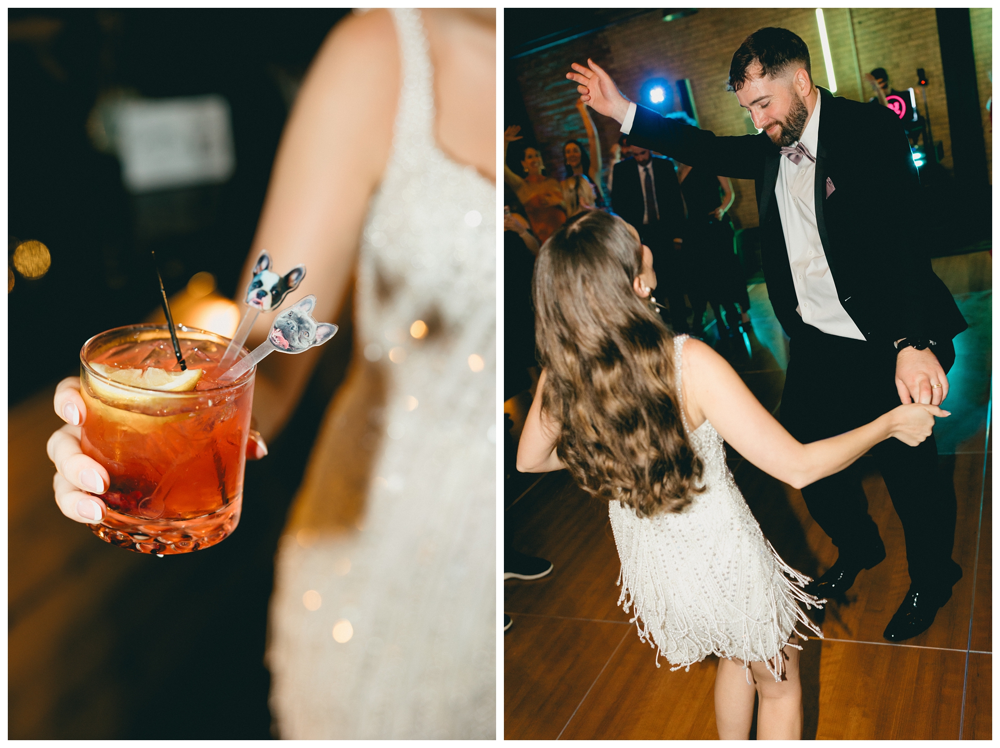 The sounds of the Art Prize Celebration floated up from the streets to the upper levels of the Grand Rapids skyline on the morning of Sarah and Jeff’s wedding. The Amway Grand Plaza, one of Grand Rapid’s finest hotels, provided exquisite rooms and elegant aesthetics for both Sarah and Jeff to prepare for the day, surrounded by those that they held dearest. Instead of waiting til later into the day, Sarah and Jeff had always wanted to get married as quickly into the day as possible, so after a quick ride over to New Vintage Place, the bridal party hid away as guests began to arrive for the ceremony. All eyes were on Sarah as her father escorted her down the aisle, right in the arms of the man who had kept mentioning her name all morning long in eager anticipation. Before they could even believe it, their friend and officiant Griffin was announcing them as Mr. and Mrs. Jeff Perry as they recessed down the aisle to the thunderous applause of the crowd. Sarah had always felt drawn to the dramatic ambiance of New Vintage Place, and a mini “studio session” in the middle of the wedding day provided some truly iconic portraits of both Sarah and her new husband. However, the architecture and charm of the city called to them as well, culminating with a second portrait session along the streets of Grand Rapids rounding out their time in front of the camera. Upon their return to NVP, Sarah and Jeff were greeted by their vision come to life in the reception space, all thanks to the vendor team led by In the Details Weddings. Warm purples mixed with dusty mauve in the florals, bringing a “soft autumn” aesthetic to the space before them. As dinner was served, both Sarah’s sister and Jeff’s best friend addressed the crowd, recounting tales and memories spent with Sarah and Jeff and reminding all in the room just how special the bride and groom were to everyone in attendance. As the music began and the dance floor started filling up, Sarah quietly slipped away, only to return in an iconic entrance with an outfit change that signaled to all that the party was just getting started.