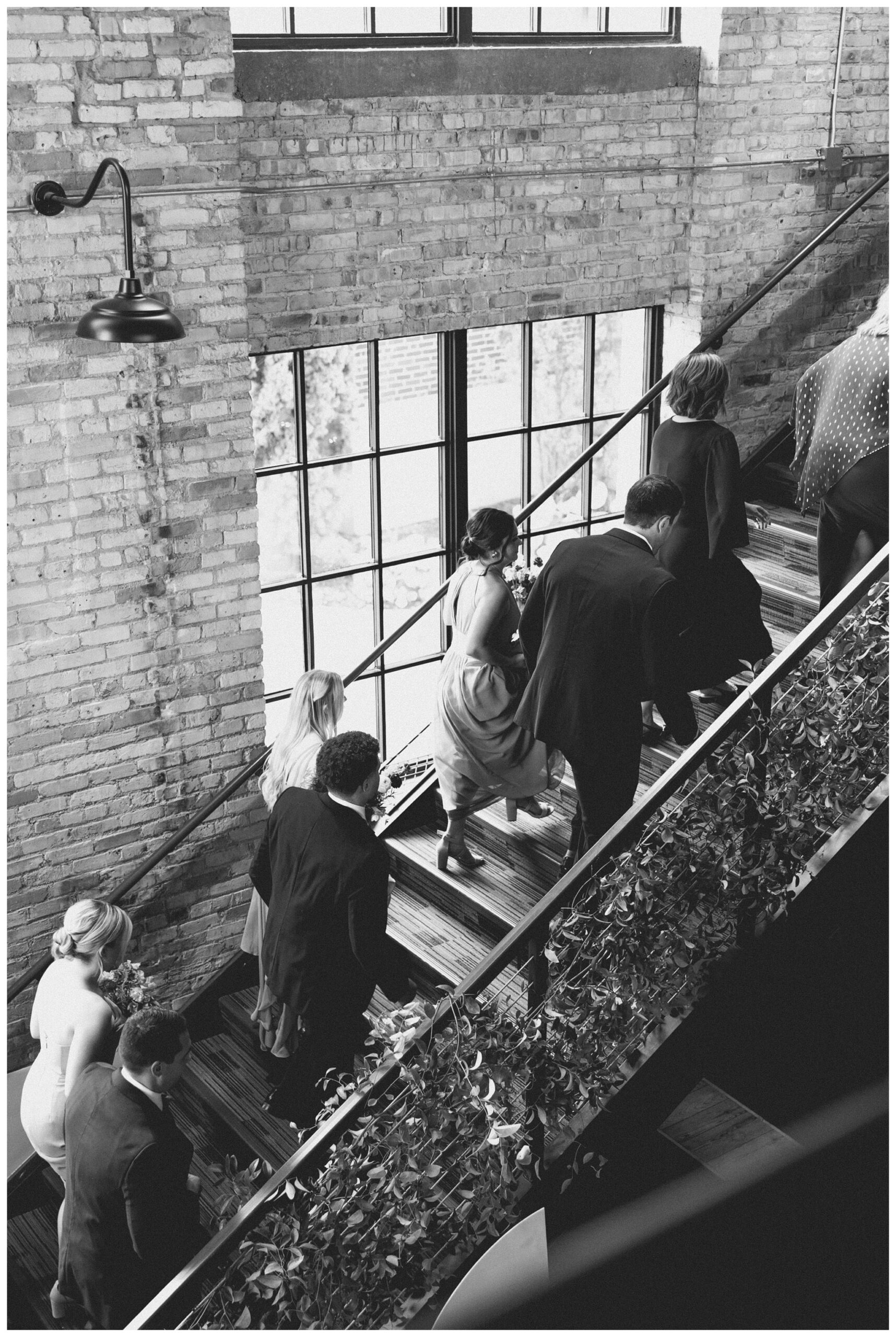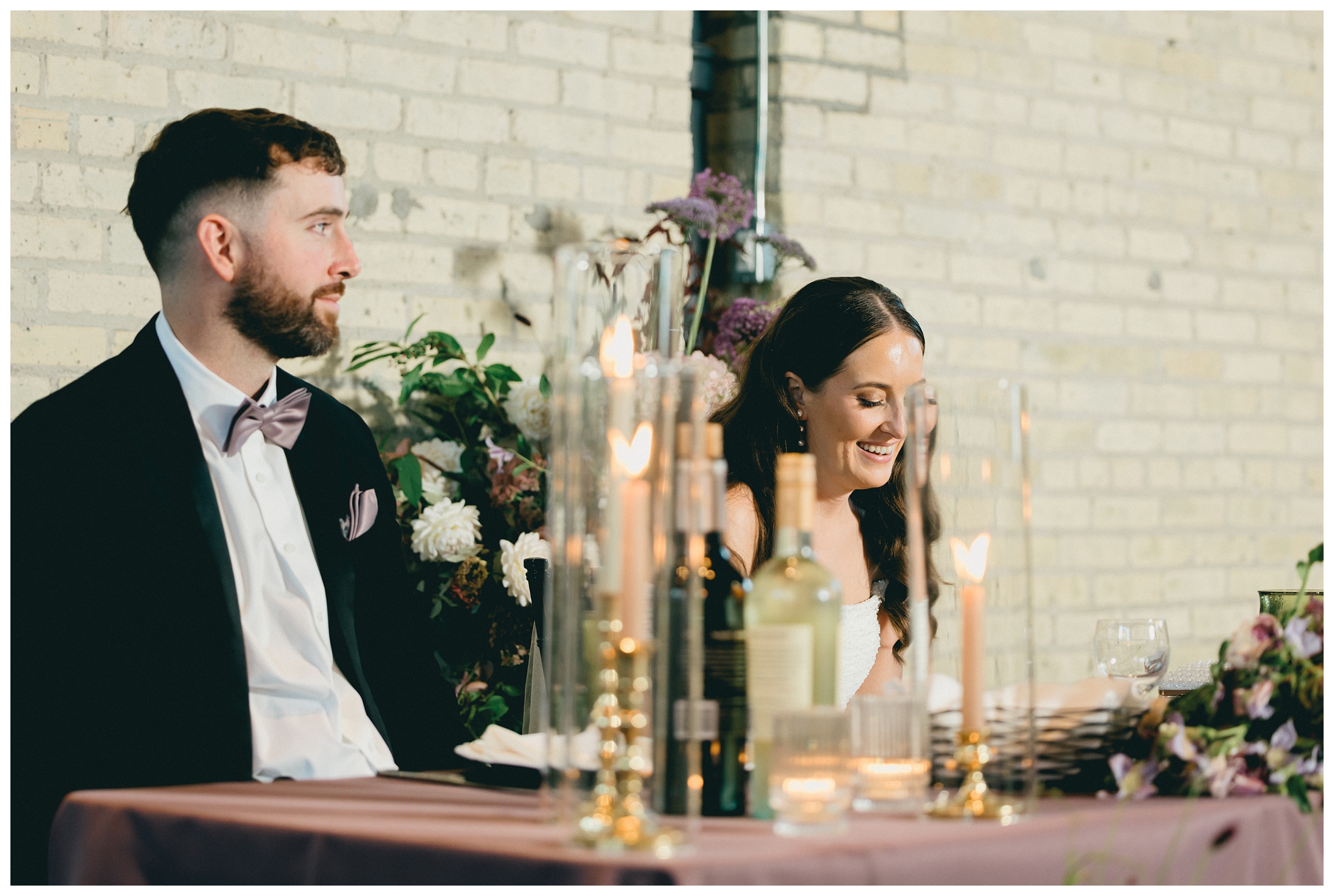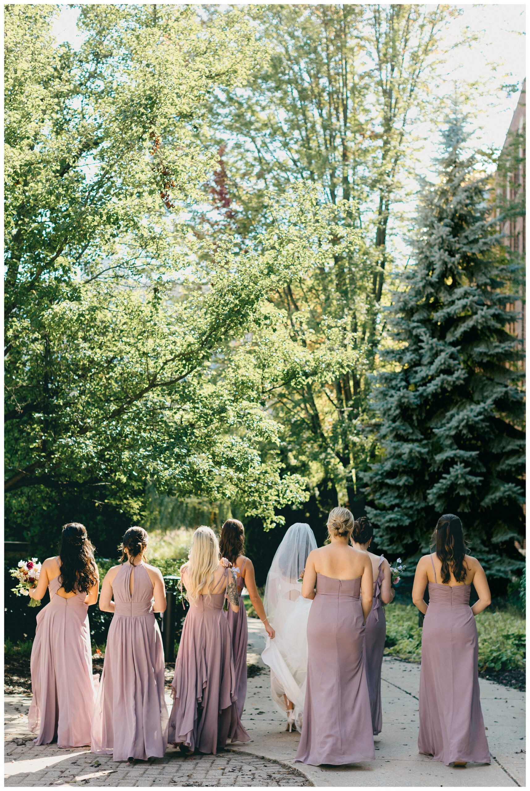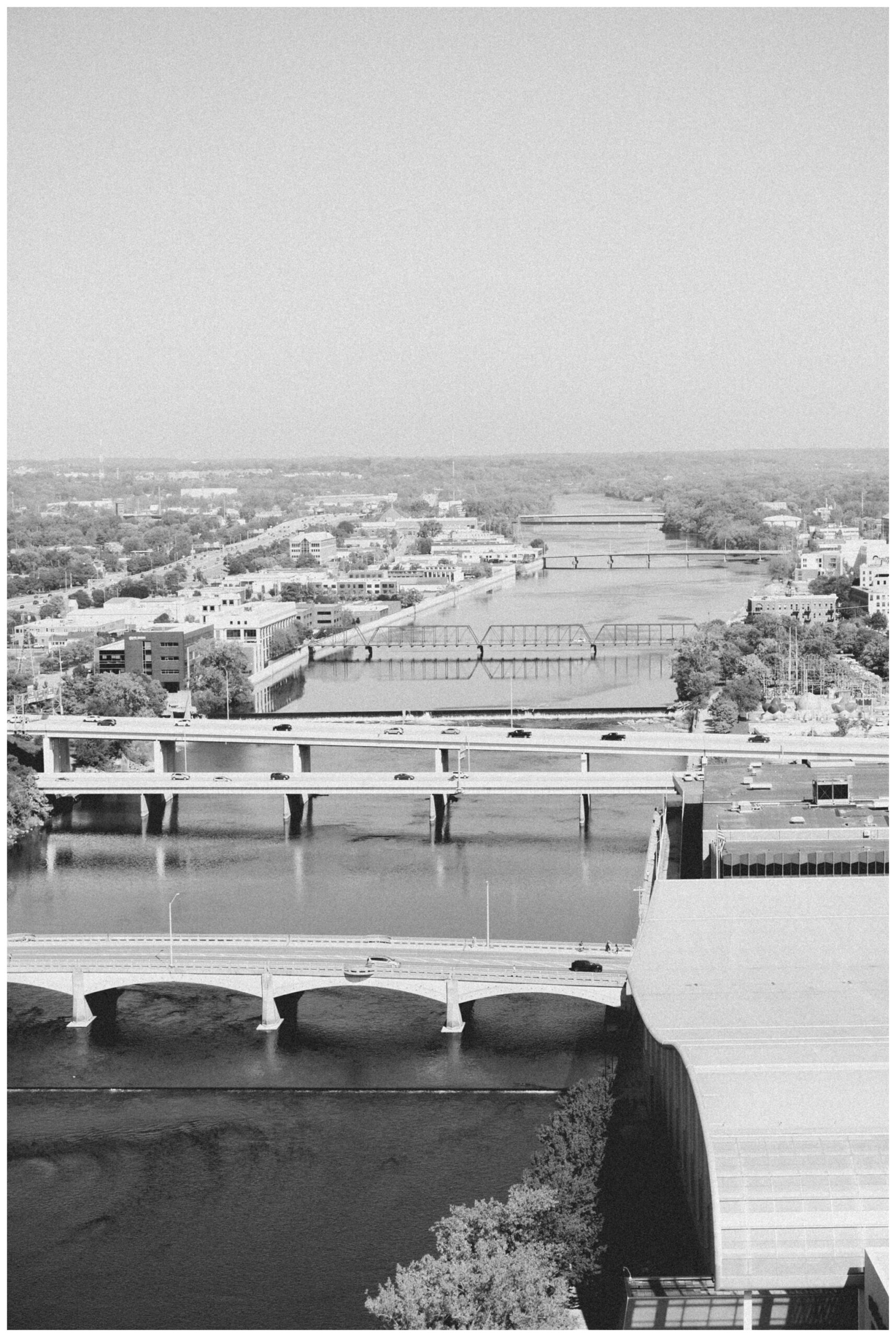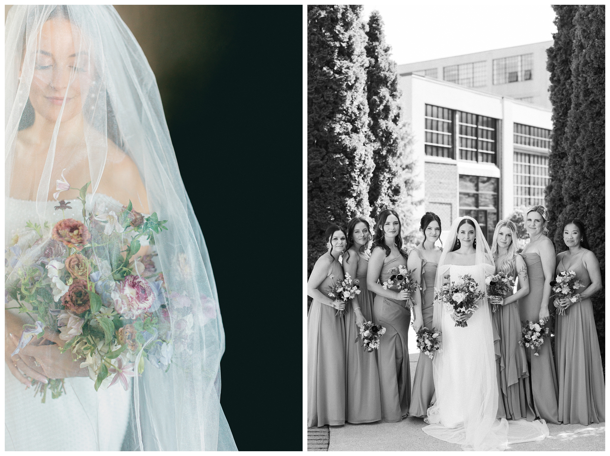 The sounds of the Art Prize Celebration floated up from the streets to the upper levels of the Grand Rapids skyline on the morning of Sarah and Jeff’s wedding. The Amway Grand Plaza, one of Grand Rapid’s finest hotels, provided exquisite rooms and elegant aesthetics for both Sarah and Jeff to prepare for the day, surrounded by those that they held dearest. Instead of waiting til later into the day, Sarah and Jeff had always wanted to get married as quickly into the day as possible, so after a quick ride over to New Vintage Place, the bridal party hid away as guests began to arrive for the ceremony. All eyes were on Sarah as her father escorted her down the aisle, right in the arms of the man who had kept mentioning her name all morning long in eager anticipation. Before they could even believe it, their friend and officiant Griffin was announcing them as Mr. and Mrs. Jeff Perry as they recessed down the aisle to the thunderous applause of the crowd. Sarah had always felt drawn to the dramatic ambiance of New Vintage Place, and a mini “studio session” in the middle of the wedding day provided some truly iconic portraits of both Sarah and her new husband. However, the architecture and charm of the city called to them as well, culminating with a second portrait session along the streets of Grand Rapids rounding out their time in front of the camera. Upon their return to NVP, Sarah and Jeff were greeted by their vision come to life in the reception space, all thanks to the vendor team led by In the Details Weddings. Warm purples mixed with dusty mauve in the florals, bringing a “soft autumn” aesthetic to the space before them. As dinner was served, both Sarah’s sister and Jeff’s best friend addressed the crowd, recounting tales and memories spent with Sarah and Jeff and reminding all in the room just how special the bride and groom were to everyone in attendance. As the music began and the dance floor started filling up, Sarah quietly slipped away, only to return in an iconic entrance with an outfit change that signaled to all that the party was just getting started.