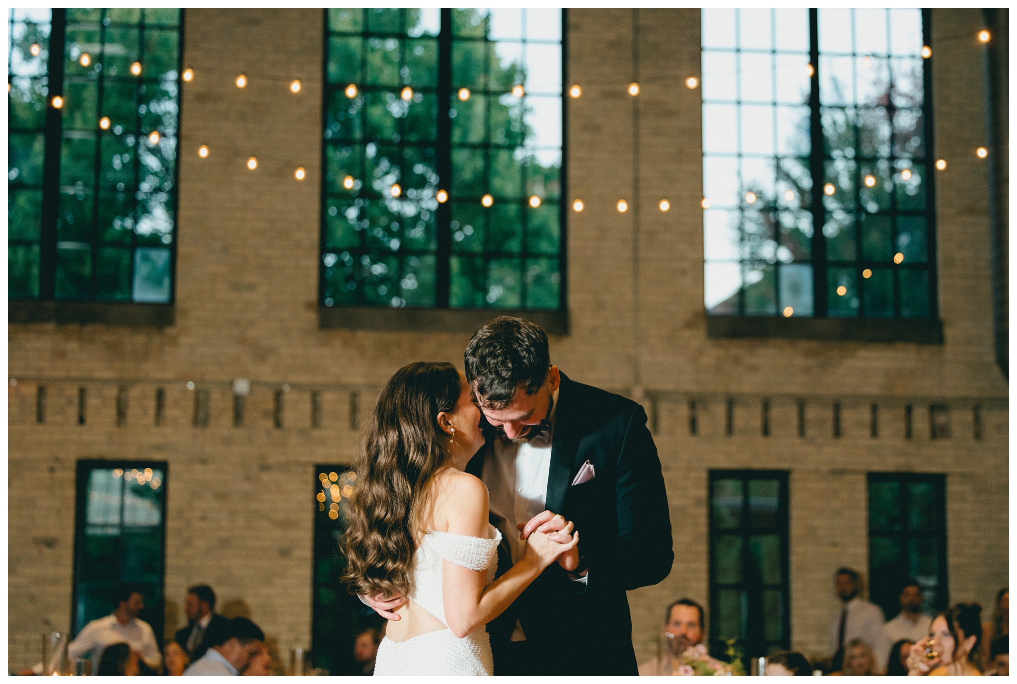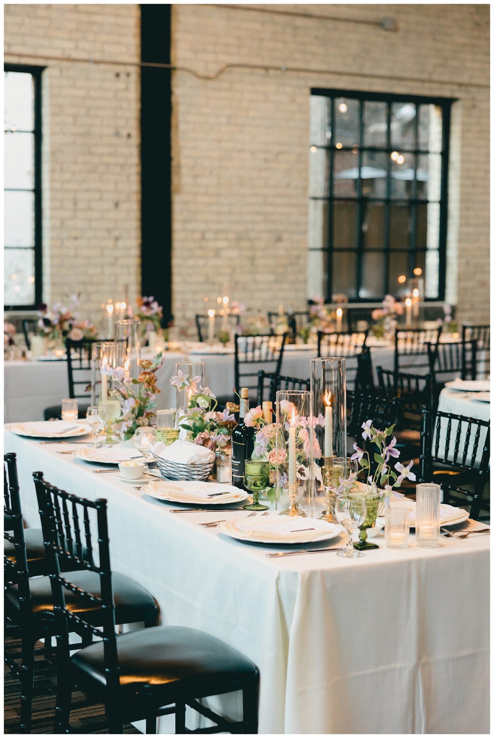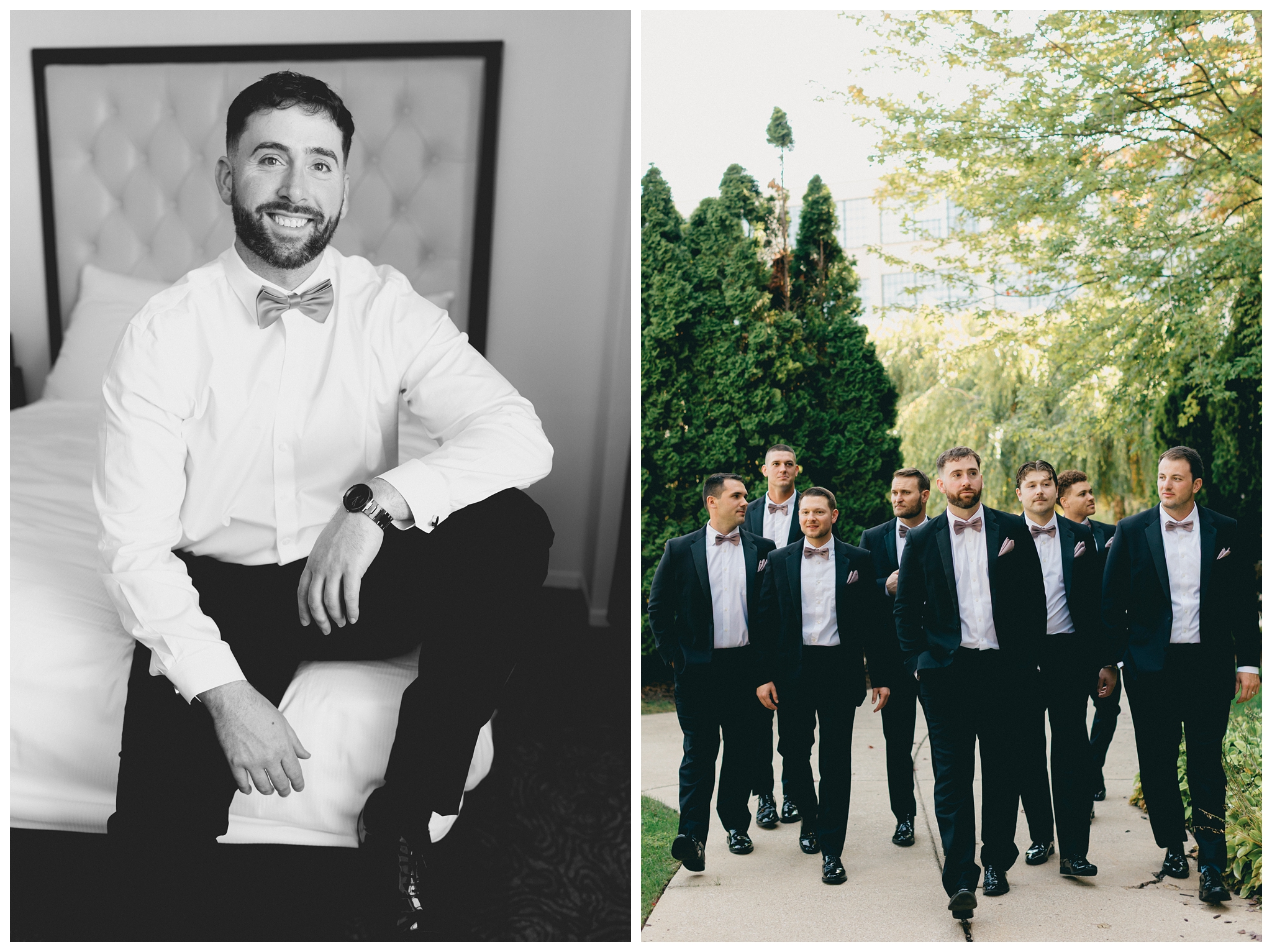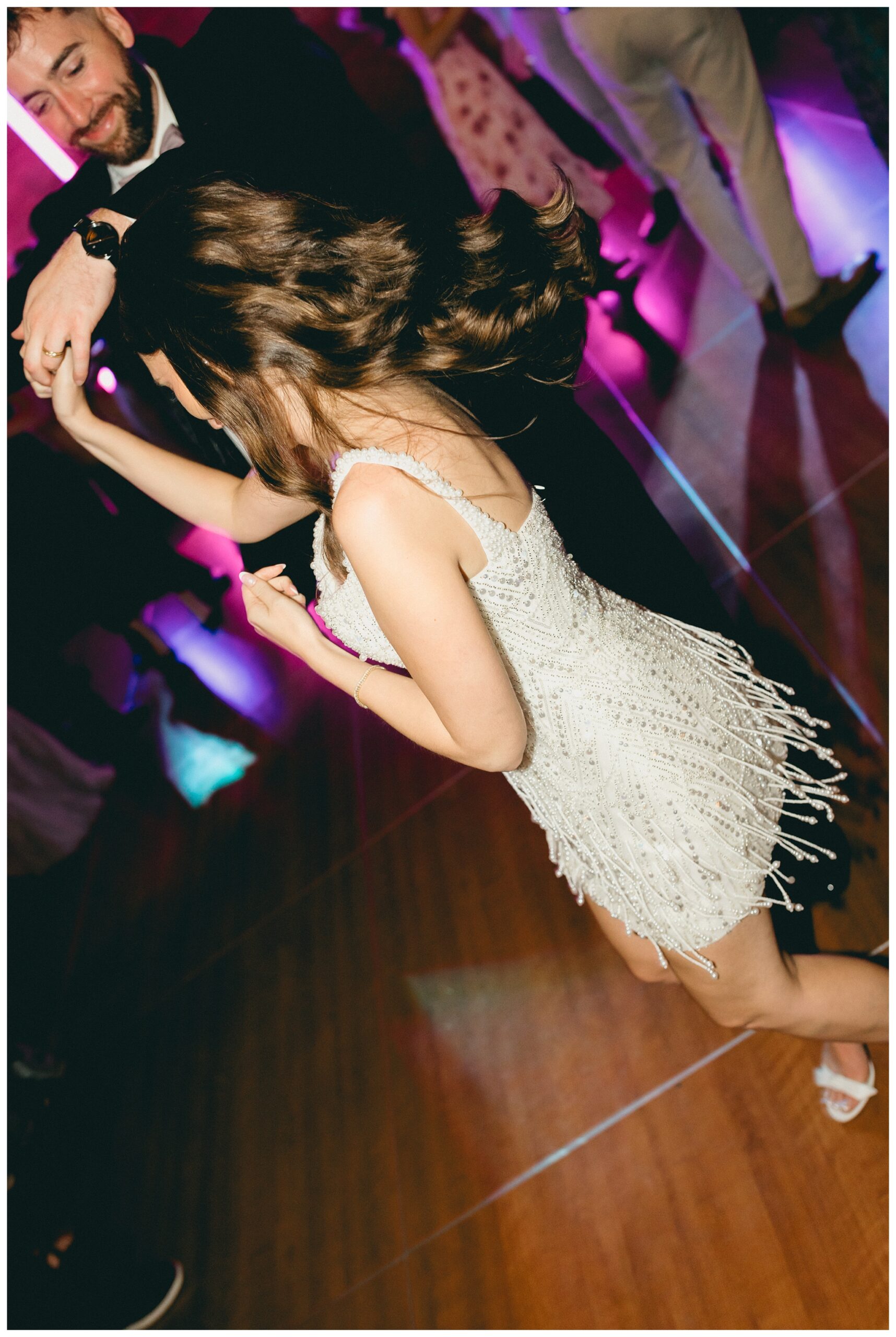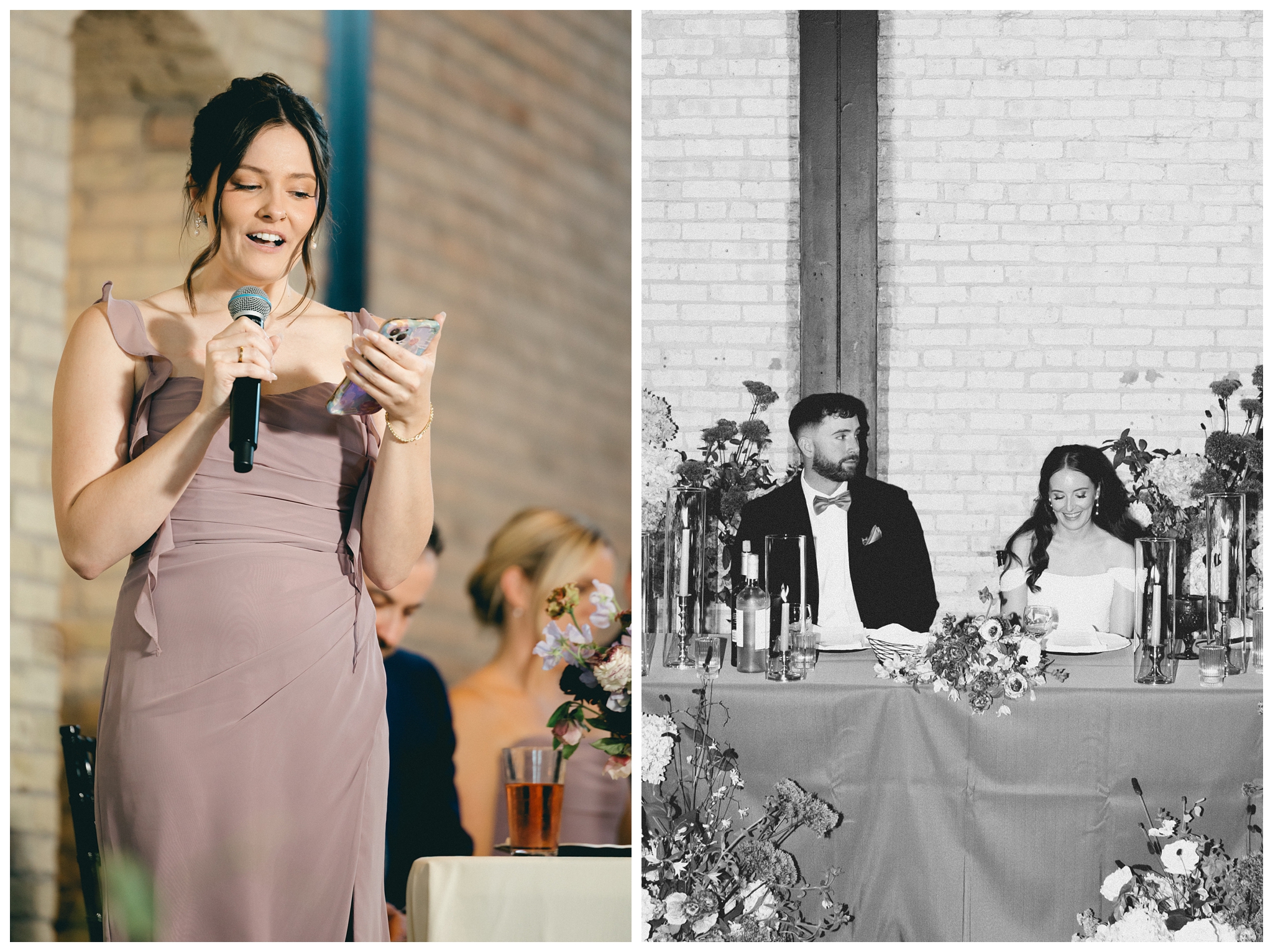 The sounds of the Art Prize Celebration floated up from the streets to the upper levels of the Grand Rapids skyline on the morning of Sarah and Jeff’s wedding. The Amway Grand Plaza, one of Grand Rapid’s finest hotels, provided exquisite rooms and elegant aesthetics for both Sarah and Jeff to prepare for the day, surrounded by those that they held dearest. Instead of waiting til later into the day, Sarah and Jeff had always wanted to get married as quickly into the day as possible, so after a quick ride over to New Vintage Place, the bridal party hid away as guests began to arrive for the ceremony. All eyes were on Sarah as her father escorted her down the aisle, right in the arms of the man who had kept mentioning her name all morning long in eager anticipation. Before they could even believe it, their friend and officiant Griffin was announcing them as Mr. and Mrs. Jeff Perry as they recessed down the aisle to the thunderous applause of the crowd. Sarah had always felt drawn to the dramatic ambiance of New Vintage Place, and a mini “studio session” in the middle of the wedding day provided some truly iconic portraits of both Sarah and her new husband. However, the architecture and charm of the city called to them as well, culminating with a second portrait session along the streets of Grand Rapids rounding out their time in front of the camera. Upon their return to NVP, Sarah and Jeff were greeted by their vision come to life in the reception space, all thanks to the vendor team led by In the Details Weddings. Warm purples mixed with dusty mauve in the florals, bringing a “soft autumn” aesthetic to the space before them. As dinner was served, both Sarah’s sister and Jeff’s best friend addressed the crowd, recounting tales and memories spent with Sarah and Jeff and reminding all in the room just how special the bride and groom were to everyone in attendance. As the music began and the dance floor started filling up, Sarah quietly slipped away, only to return in an iconic entrance with an outfit change that signaled to all that the party was just getting started.