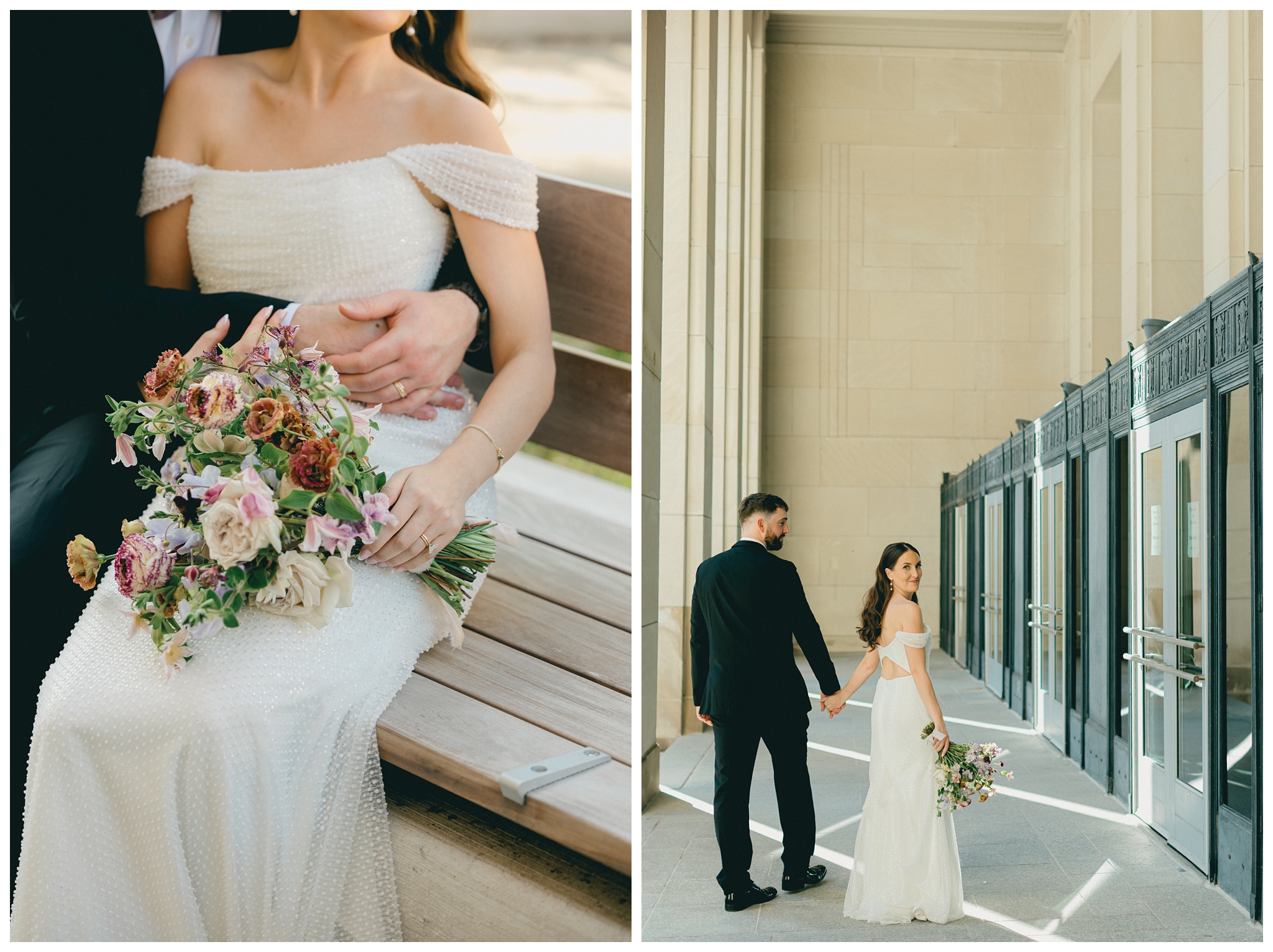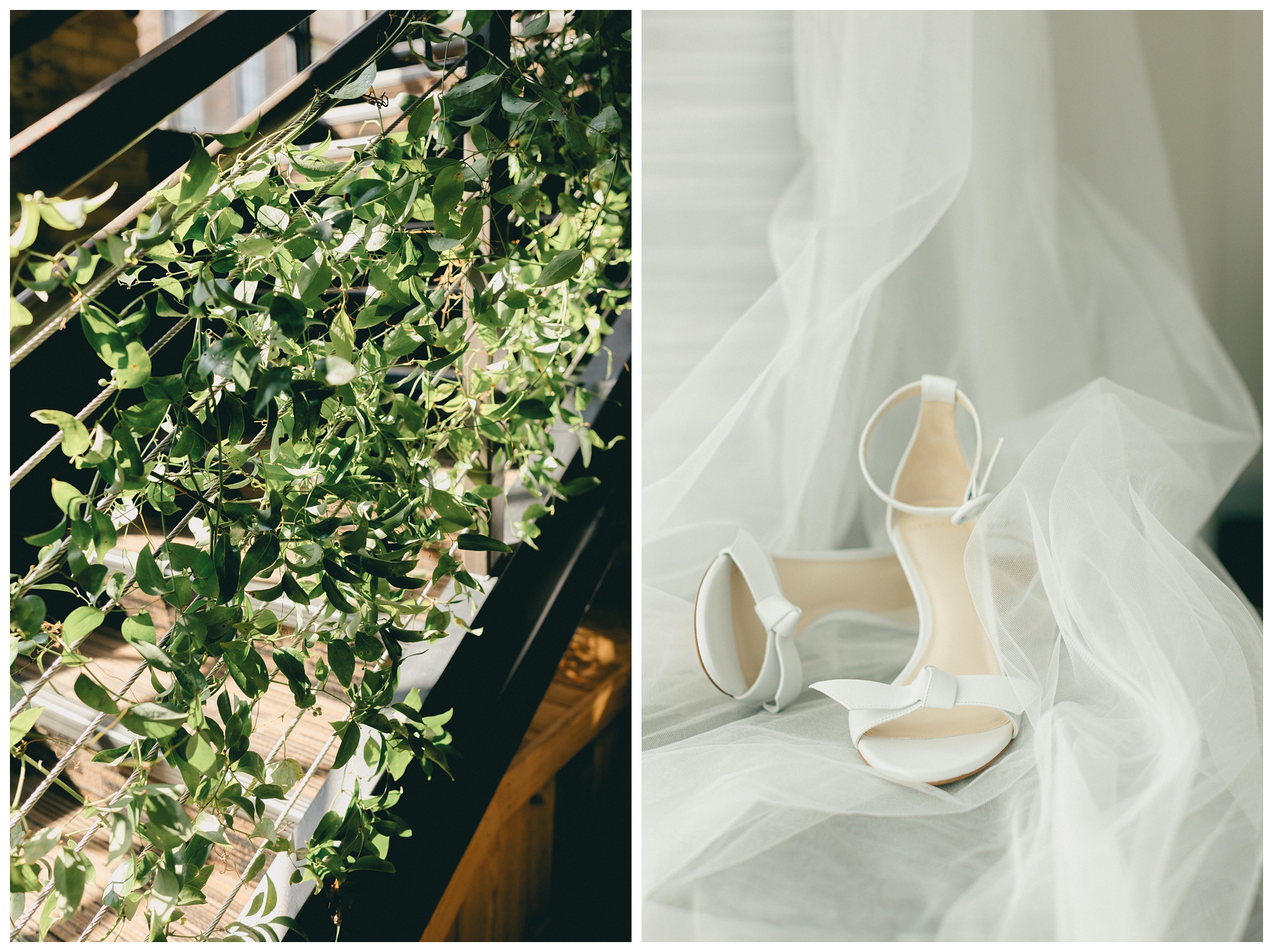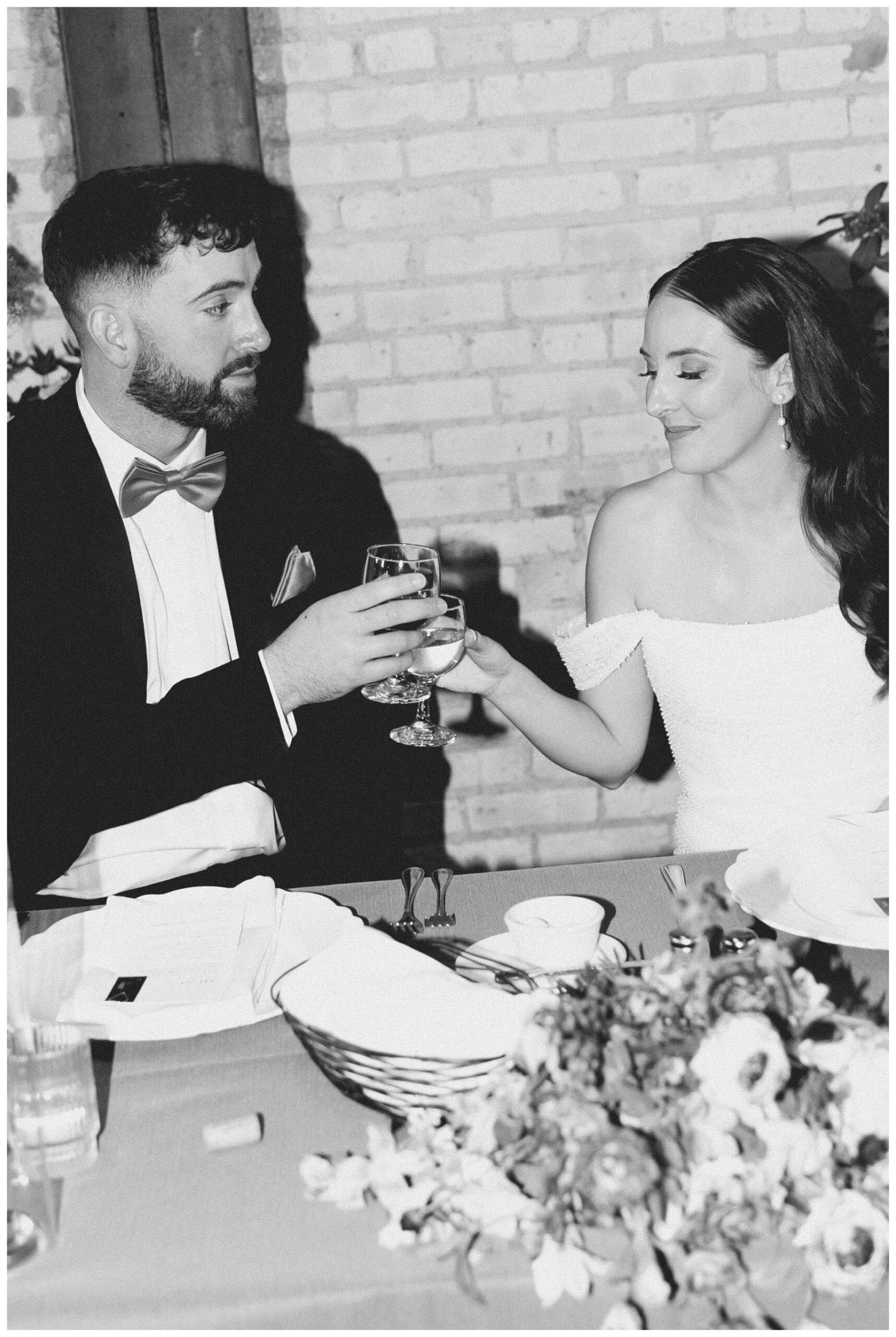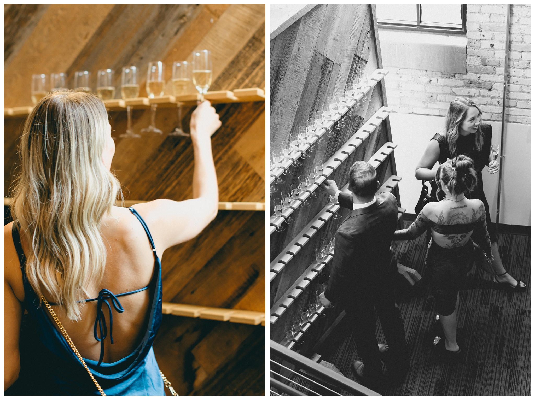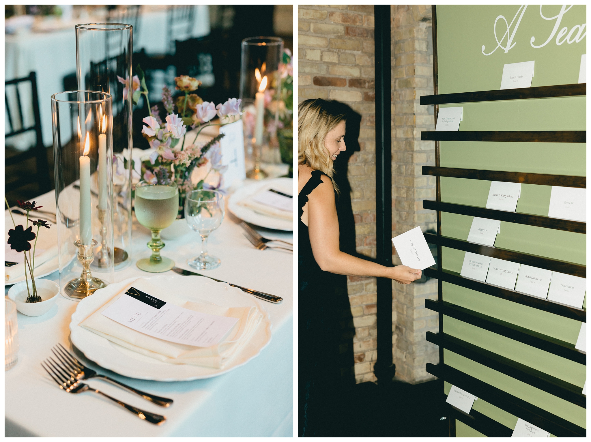 The sounds of the Art Prize Celebration floated up from the streets to the upper levels of the Grand Rapids skyline on the morning of Sarah and Jeff’s wedding. The Amway Grand Plaza, one of Grand Rapid’s finest hotels, provided exquisite rooms and elegant aesthetics for both Sarah and Jeff to prepare for the day, surrounded by those that they held dearest. Instead of waiting til later into the day, Sarah and Jeff had always wanted to get married as quickly into the day as possible, so after a quick ride over to New Vintage Place, the bridal party hid away as guests began to arrive for the ceremony. All eyes were on Sarah as her father escorted her down the aisle, right in the arms of the man who had kept mentioning her name all morning long in eager anticipation. Before they could even believe it, their friend and officiant Griffin was announcing them as Mr. and Mrs. Jeff Perry as they recessed down the aisle to the thunderous applause of the crowd. Sarah had always felt drawn to the dramatic ambiance of New Vintage Place, and a mini “studio session” in the middle of the wedding day provided some truly iconic portraits of both Sarah and her new husband. However, the architecture and charm of the city called to them as well, culminating with a second portrait session along the streets of Grand Rapids rounding out their time in front of the camera. Upon their return to NVP, Sarah and Jeff were greeted by their vision come to life in the reception space, all thanks to the vendor team led by In the Details Weddings. Warm purples mixed with dusty mauve in the florals, bringing a “soft autumn” aesthetic to the space before them. As dinner was served, both Sarah’s sister and Jeff’s best friend addressed the crowd, recounting tales and memories spent with Sarah and Jeff and reminding all in the room just how special the bride and groom were to everyone in attendance. As the music began and the dance floor started filling up, Sarah quietly slipped away, only to return in an iconic entrance with an outfit change that signaled to all that the party was just getting started.
